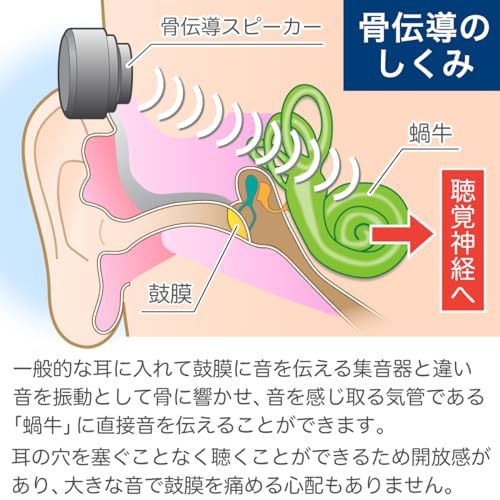 小型・軽量:耳を塞がない骨伝導集音器なのでストレスは軽減。メガネをつけたままでも使用可能で、長時間装着での負担が少なくなっています。