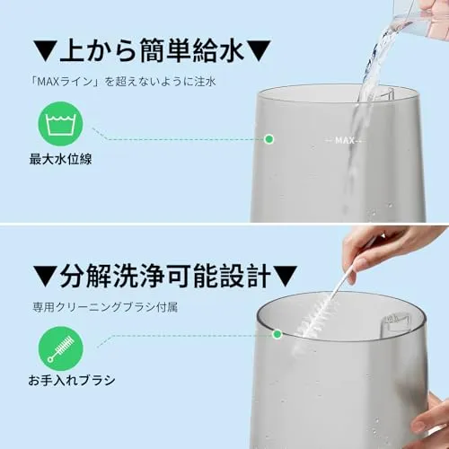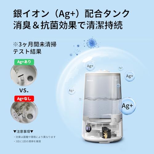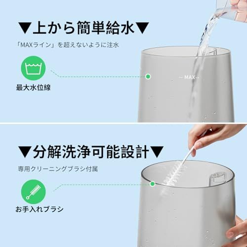 【安心のAg抗菌、取り外して洗える設計、上部給水も簡単】?水槽内にAg(銀イオン)を添加することで、優れた消臭・抗菌効果を発揮します。きれいなミストで家族の健康を守ります。 ?水タンクとベースが別々になっており、別々に分解して洗浄することができます。水タンク内部やノズルの細かい部分まで簡単に掃除できる専用洗浄ブラシが付属しています。 ?3日に1回定期的に掃除することをお勧めします*。効果は菌の種類や環境によって異なりますが、丁寧にメンテナンス