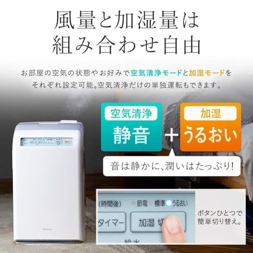 風量と加湿量は組み合わせ自由。お部屋の空気の状況やお好みで、空気清浄モードと加湿モードをそれぞれ設定可能。空気清浄だけの単独運転も可能です。