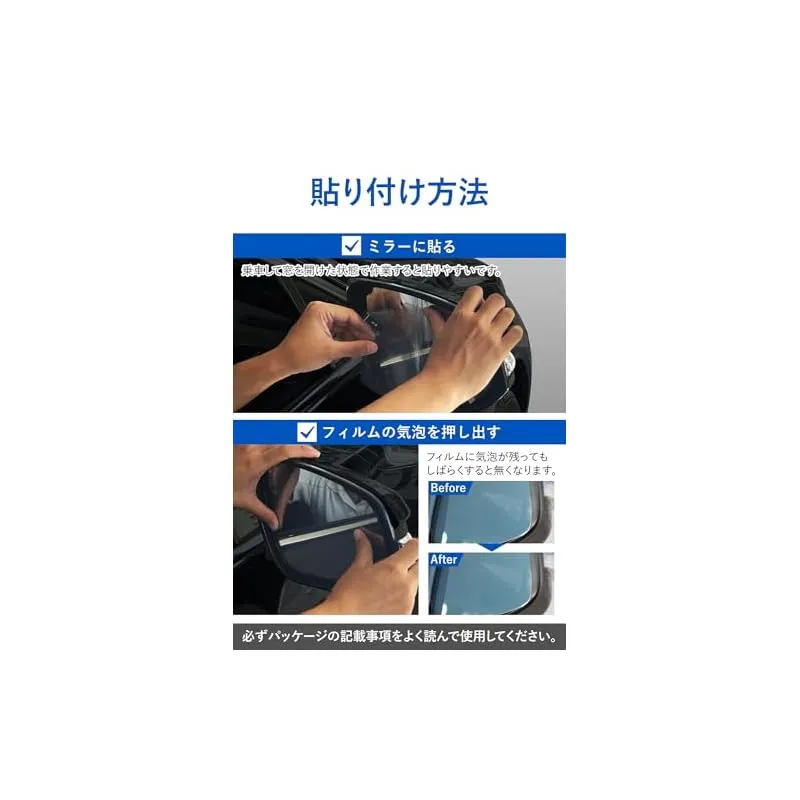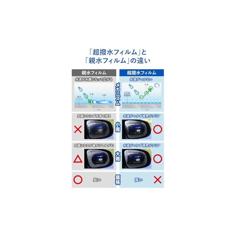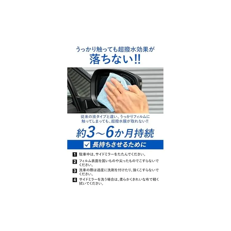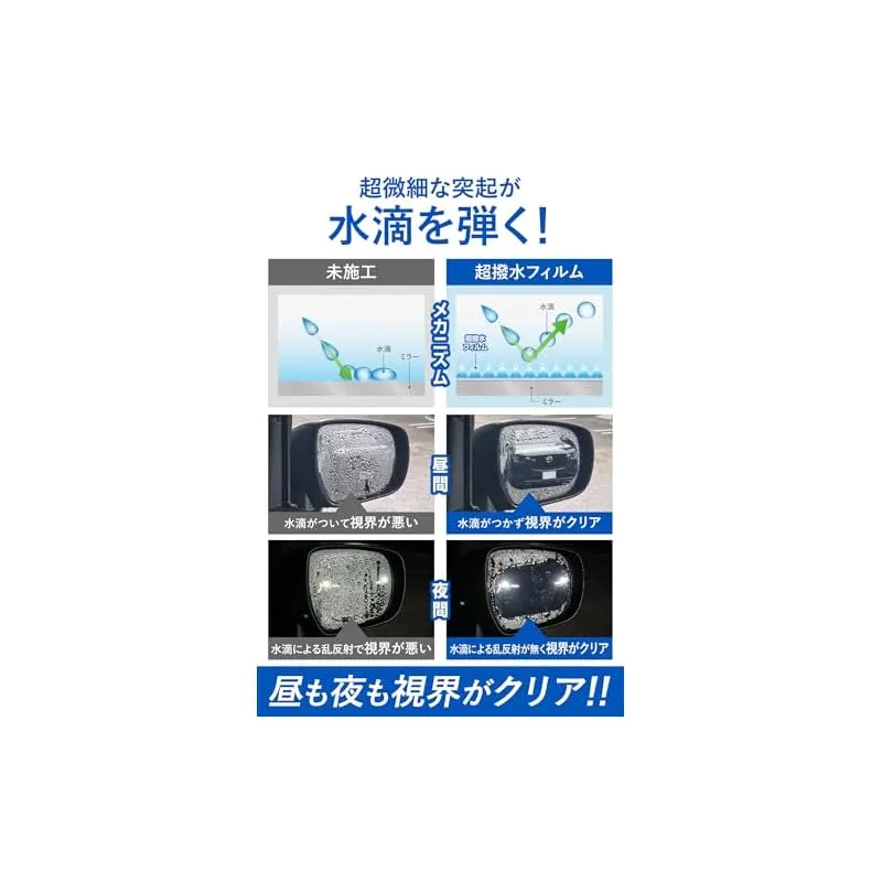 ◆雨がつかない超撥水フィルム 表面に超微細な突起を形成した特殊な超撥水フィルム。 停車中(0km/h)でも雨がつかないので、雨の日の視界がすっきりクリア。 風が当たりにくいサイドミラーに最適です。