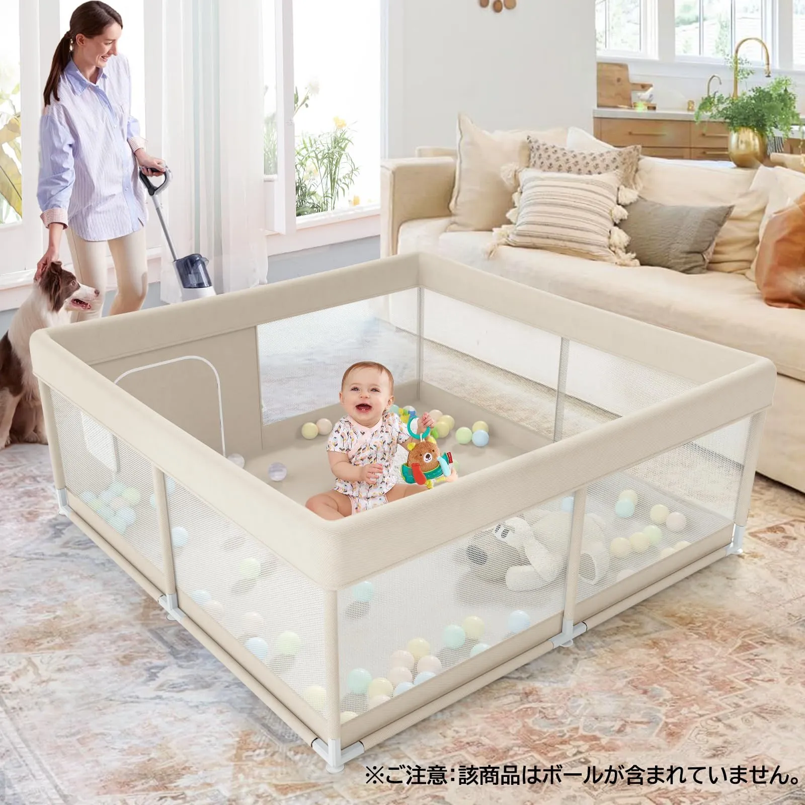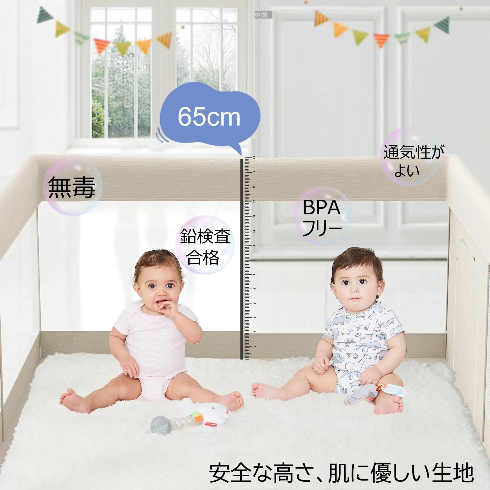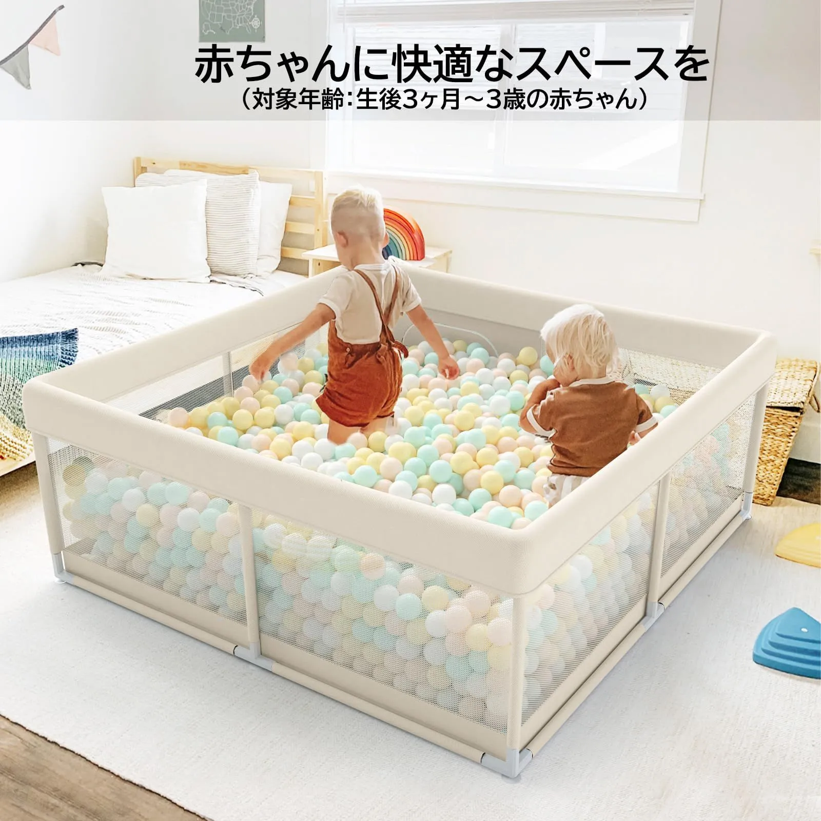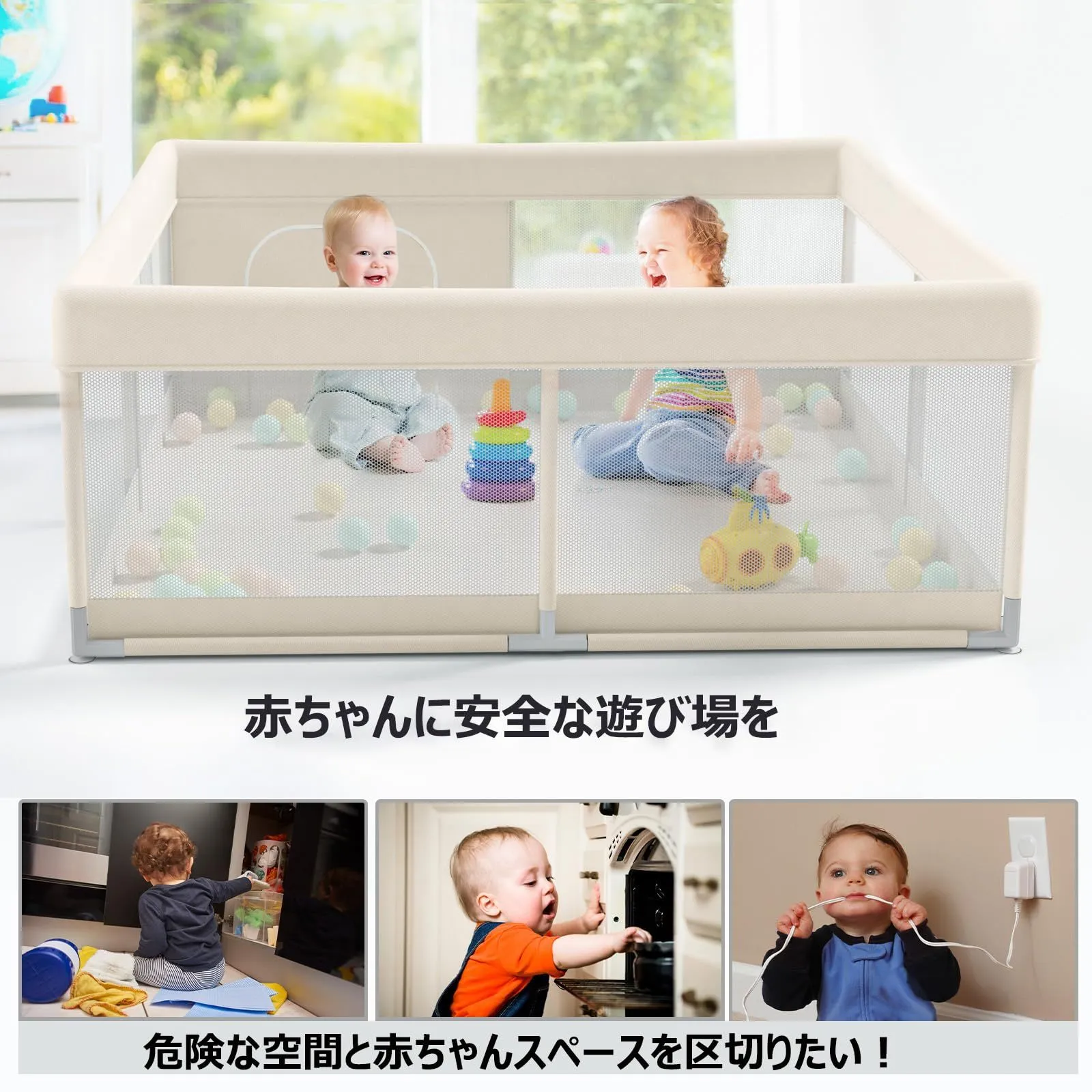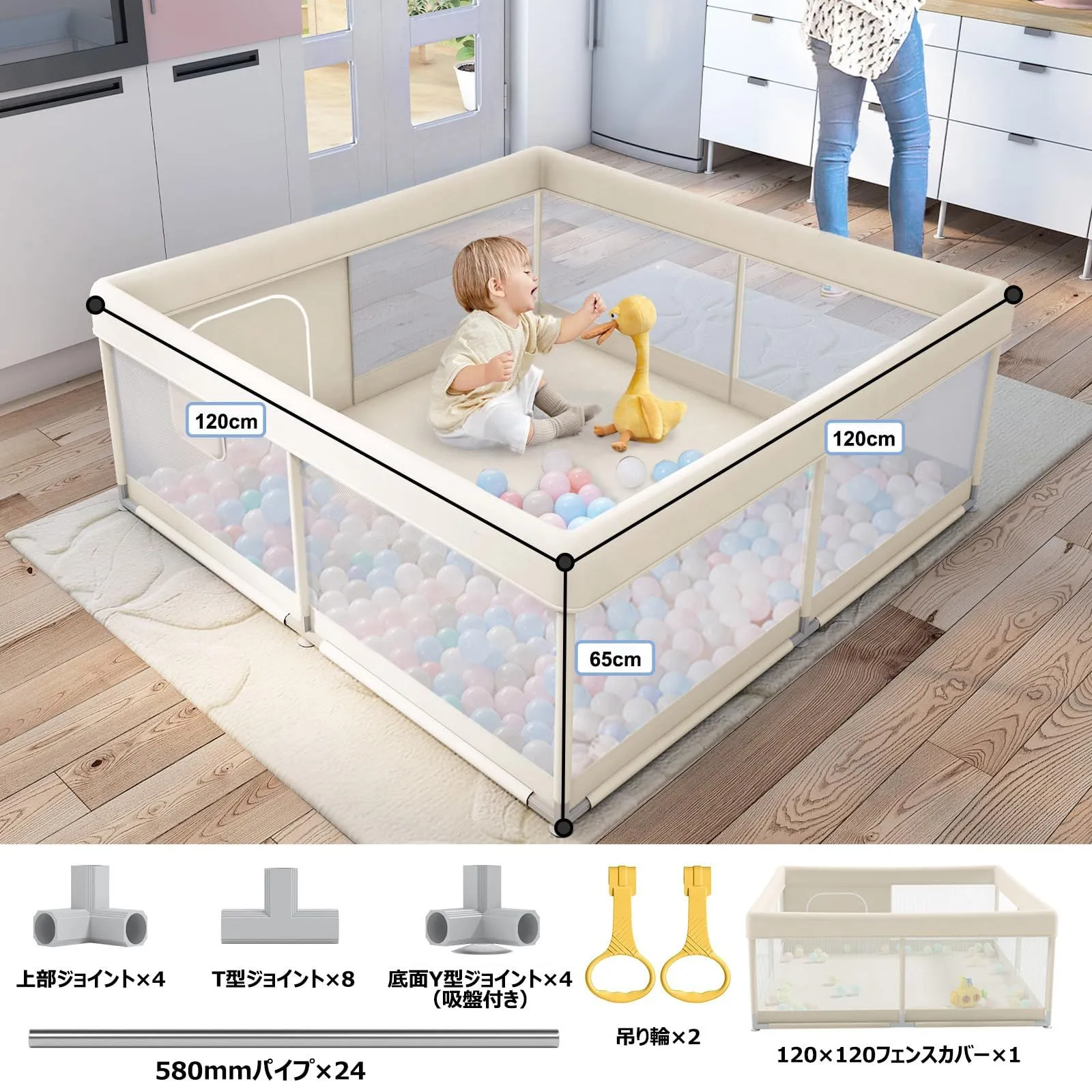 【アパートにぴったりの正方形タイプ】コンパクトなサイズが新登場!このベビーサークルは120x120x65cmで、お部屋に設置しやすいです。お部屋の小さなスペースや寝室などにもちょうどよいサイズ感です。