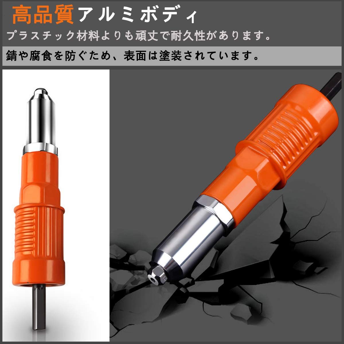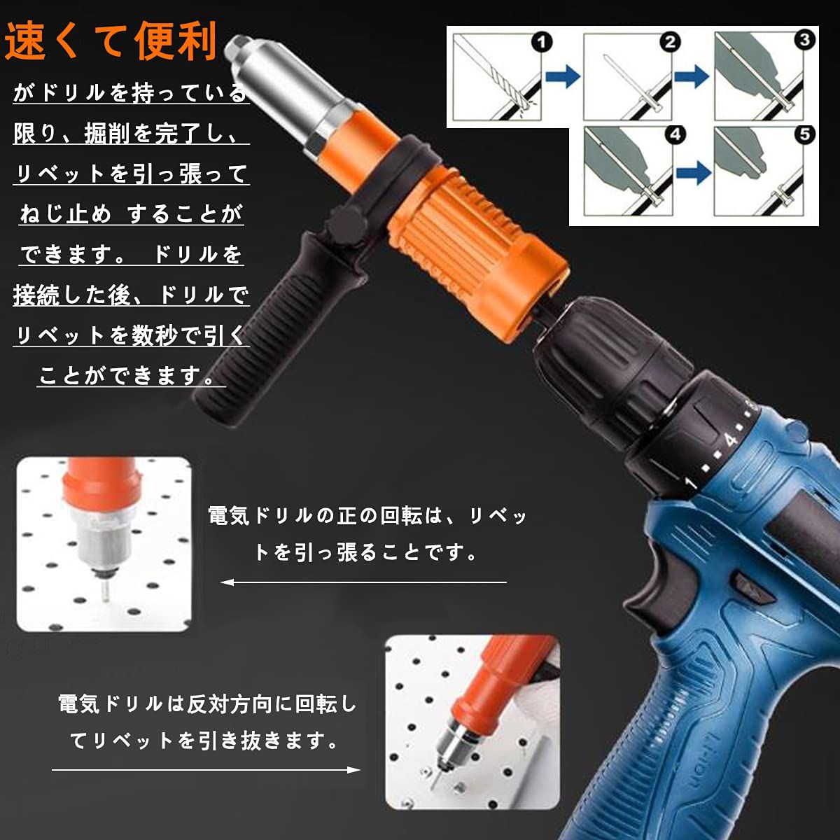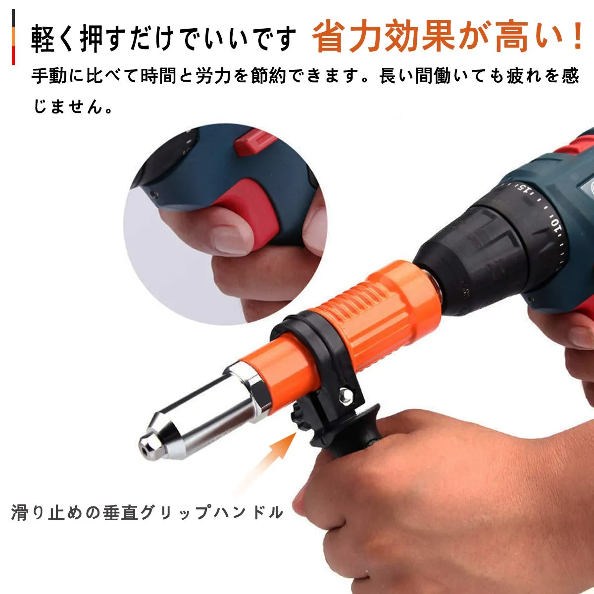【DIYの強い味方】インパクトドライバーに取り付けるだけで電動でリベット打ちができるコードレスリベットガ ンになります。電動なので作業に力も要らず、工場作業、家庭DIY、木工に最適です。 省力効果が高い!手動に比べて時間と労力を節約できます。長い間働いても疲れを感じません。 電動ドリルと空気圧ドリルに対応しています。注意:使用時は回転速度を1400r/min以下に保ってください。が電動ドリルを持っている限り、掘削を完了し、リベットを引っ張ってねじ止め することができます。電動ドリルを接続した後、リベットを素早く引き抜くことができ、時間と労力を節約できます。非常に迅速で正確です。