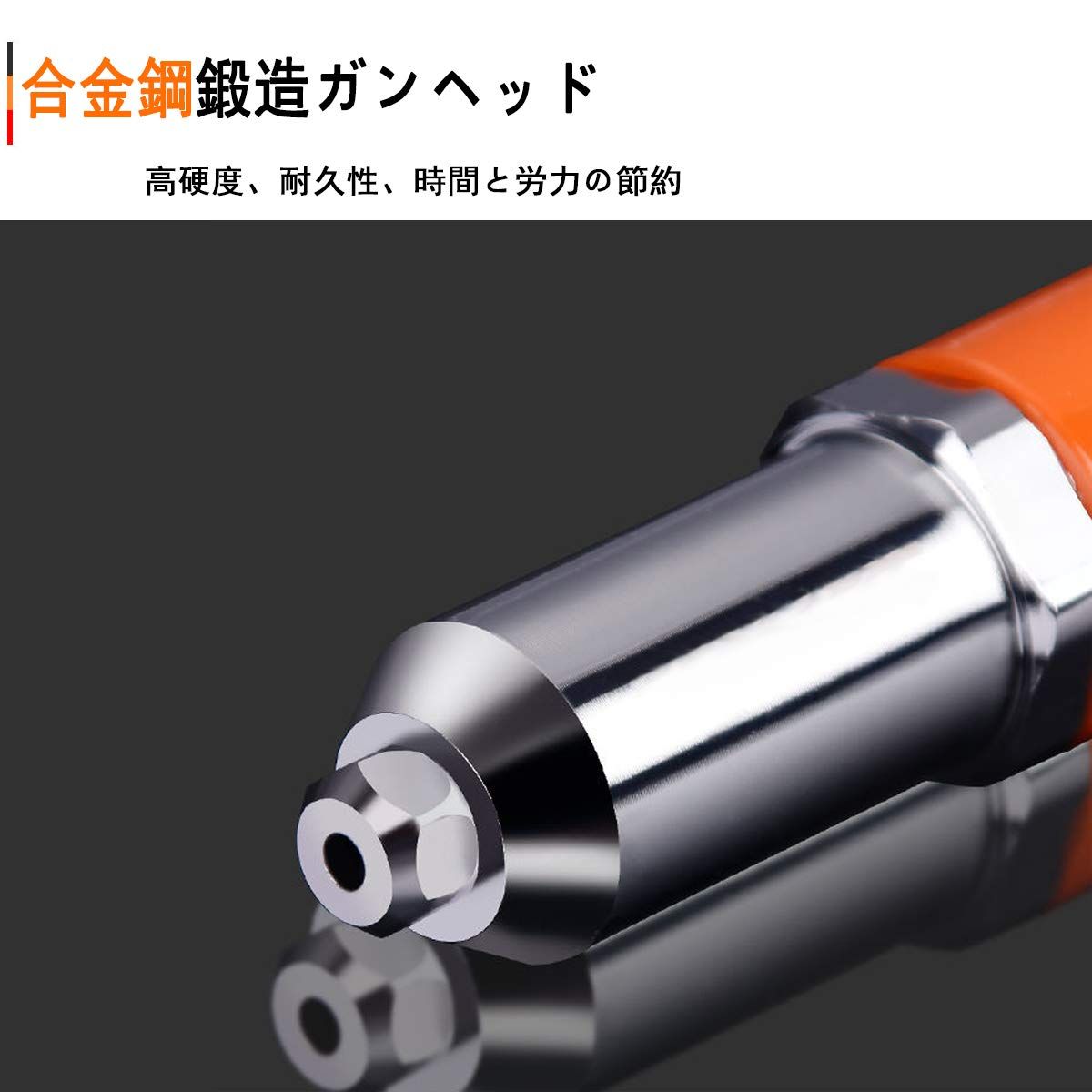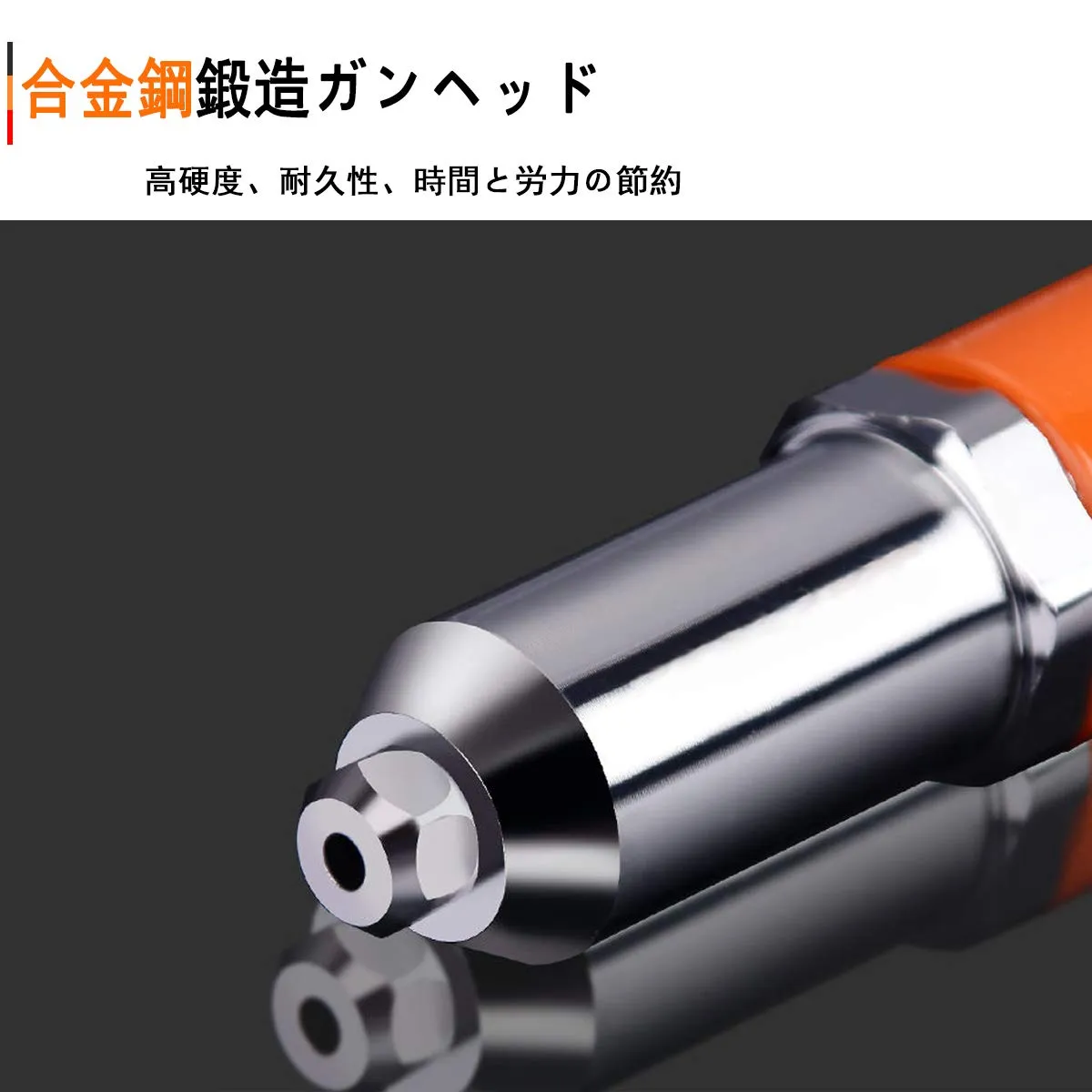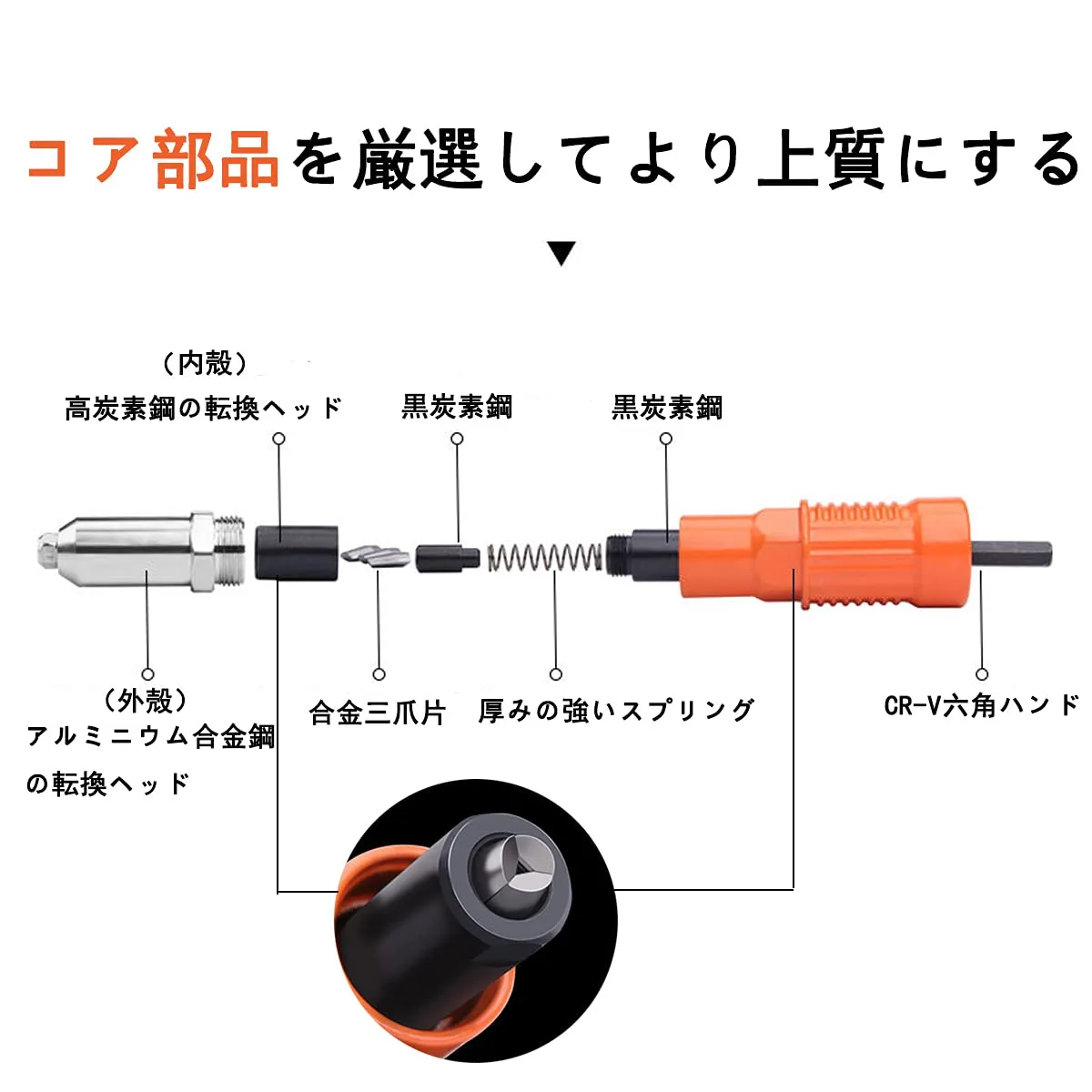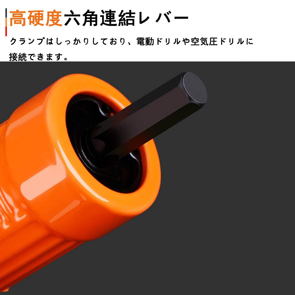 【DIYの強い味方】インパクトドライバーに取り付けるだけで電動でリベット打ちができるコードレスリベットガ ンになります。電動なので作業に力も要らず、工場作業、家庭DIY、木工に最適です。 省力効果が高い!手動に比べて時間と労力を節約できます。長い間働いても疲れを感じません。 電動ドリルと空気圧ドリルに対応しています。注意:使用時は回転速度を1400r/min以下に保ってください。が電動ドリルを持っている限り、掘削を完了し、リベットを引っ張ってねじ止め することができます。電動ドリルを接続した後、リベットを素早く引き抜くことができ、時間と労力を節約できます。非常に迅速で正確です。
