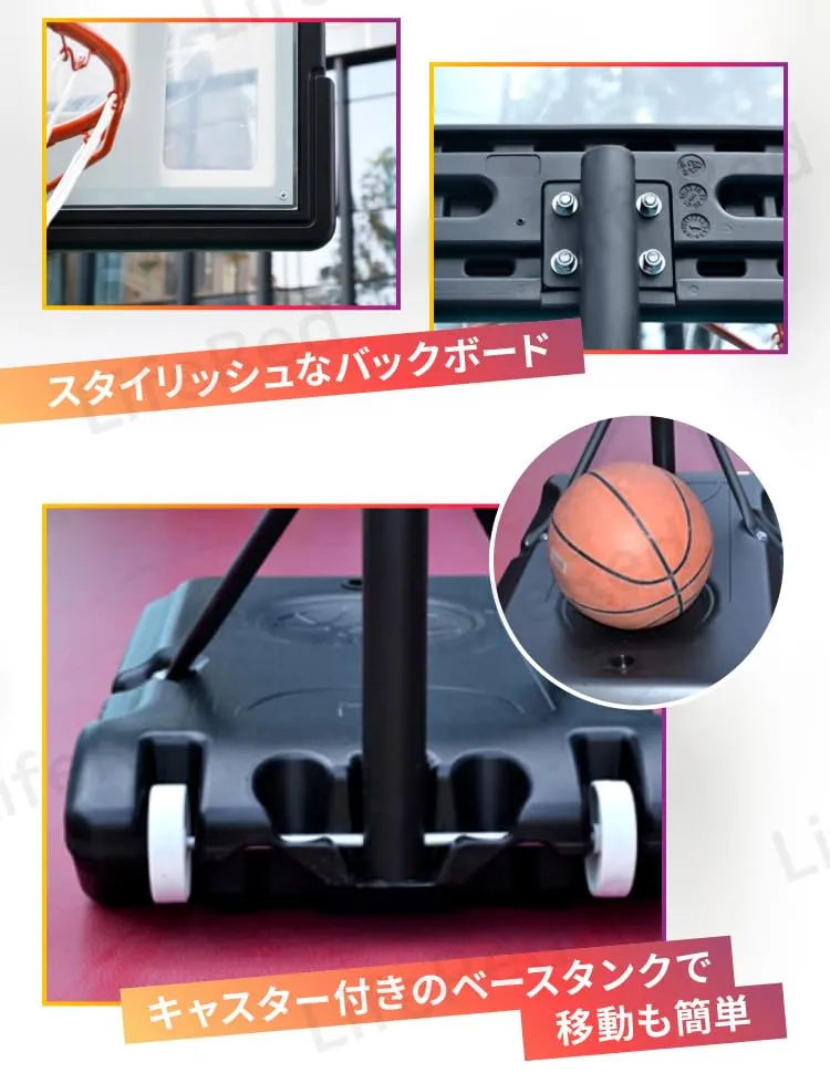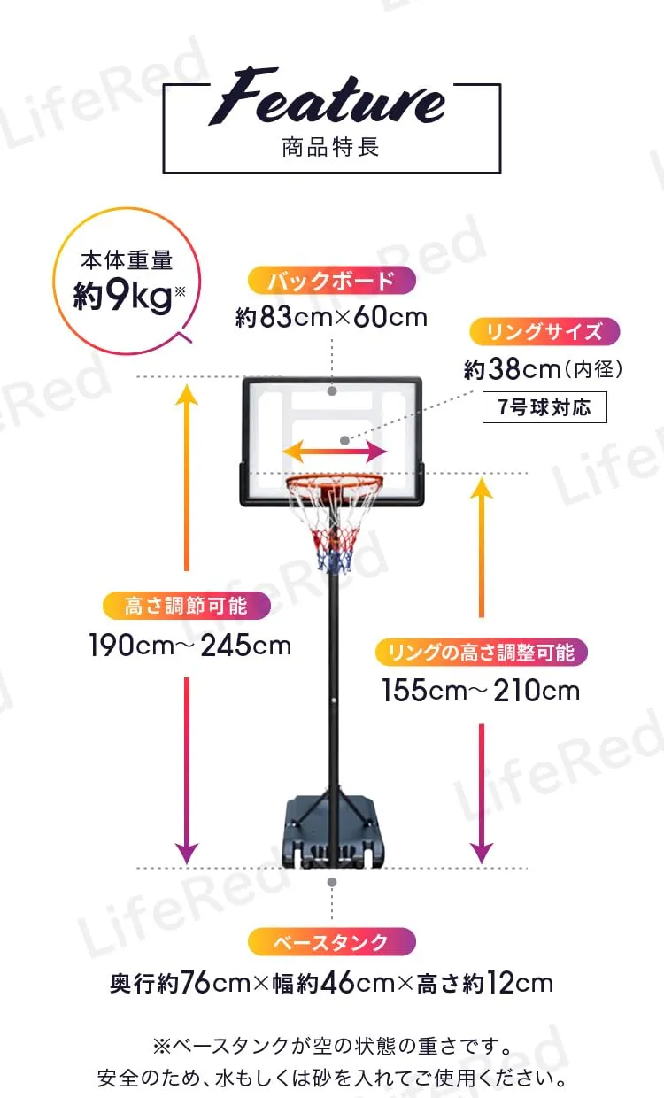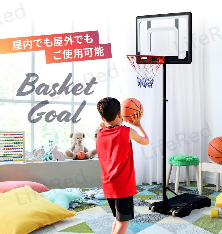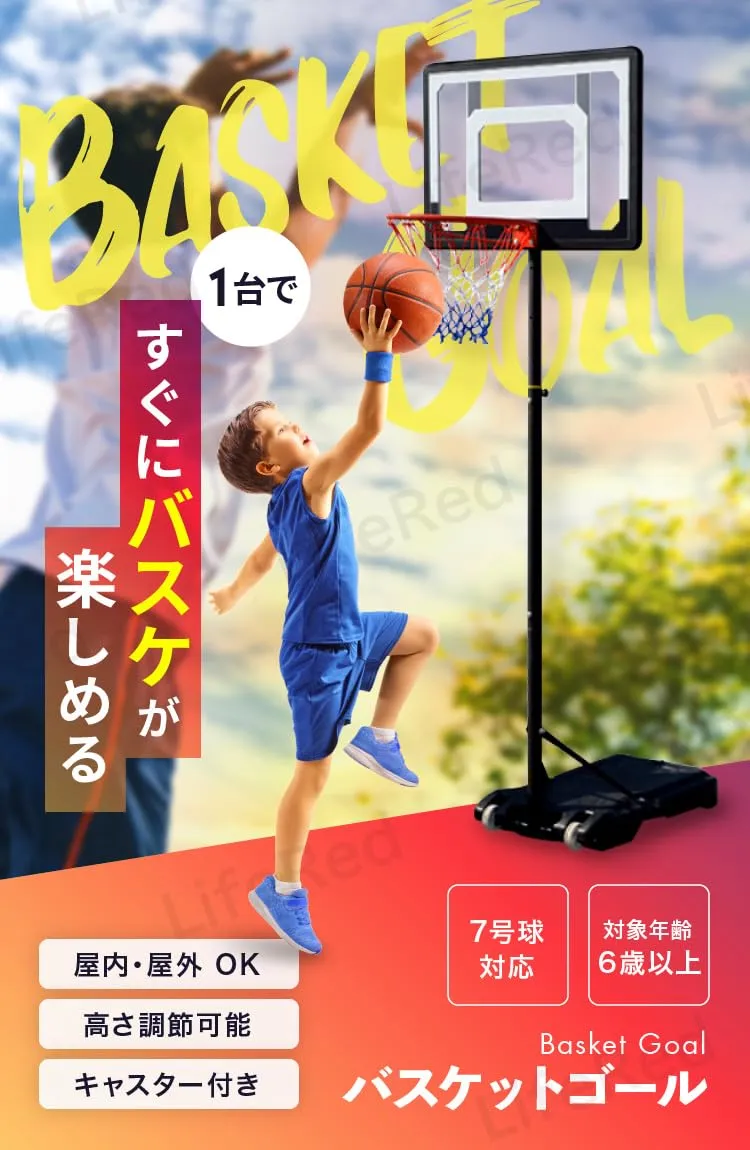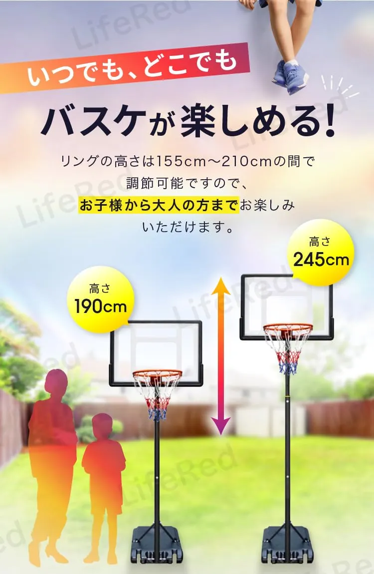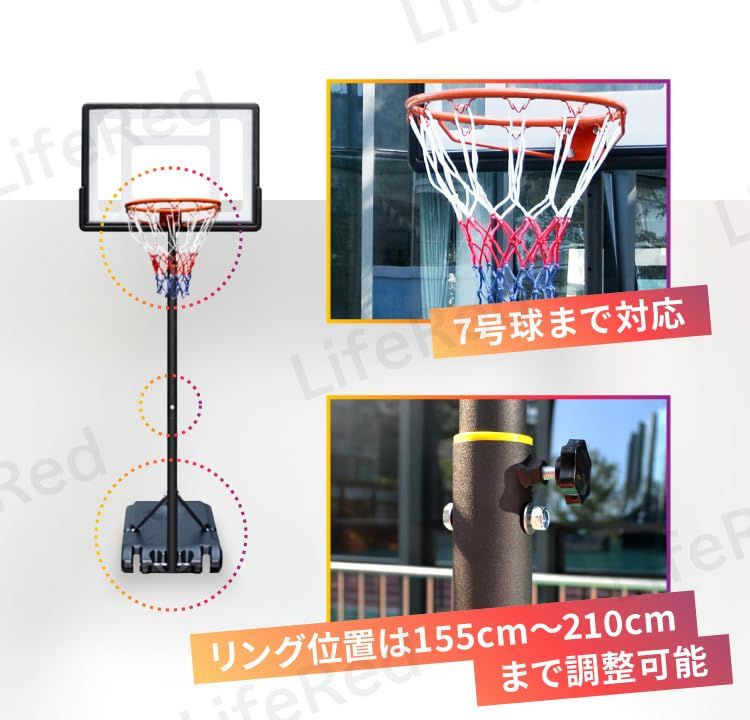 新品 【LifeRed】 バスケットゴール 7号球対応 (屋外 室内 練習用 バスケット ゴールネット リング 子供 こども用 一般用 家庭 ミニバス/ミニバスケットボール対応 高さ調節可能 移動式)
