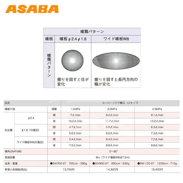 ●噴霧パターン ・品名:スーパーワイド噴口SW700-LT(L型)G1/4 ・品番:450104910 ・重量:約580g ・取付ネジ:G1/4 ・吐出量(L/min): ・ノズル[噴霧]1.5MPa:φ2.4[開]7.0、[直]10.2 ・ノズル[噴霧]1.5MPa:φ1.8(φ2.3)[開]4.7、[直]5.6 ・ノズル[噴霧]1.5MPa:ワイド噴板W8[開]5.4、[直]7.5 ・噴角(2MPa時)0~80° ・到達距離(m):9(ワイド噴板W8は7.5m) ・付属品:ホースヨリモドシ・噴板φ1.8・W8付ボールコック付 ※北海道・沖縄・離島は別途中継料がかかります。 ※季節商品のため、在庫切れ及びお届けまでお時間いただく場合がございます。お急ぎの場合は在庫確認等お問い合わせください。 商品番号:asb-450104910
