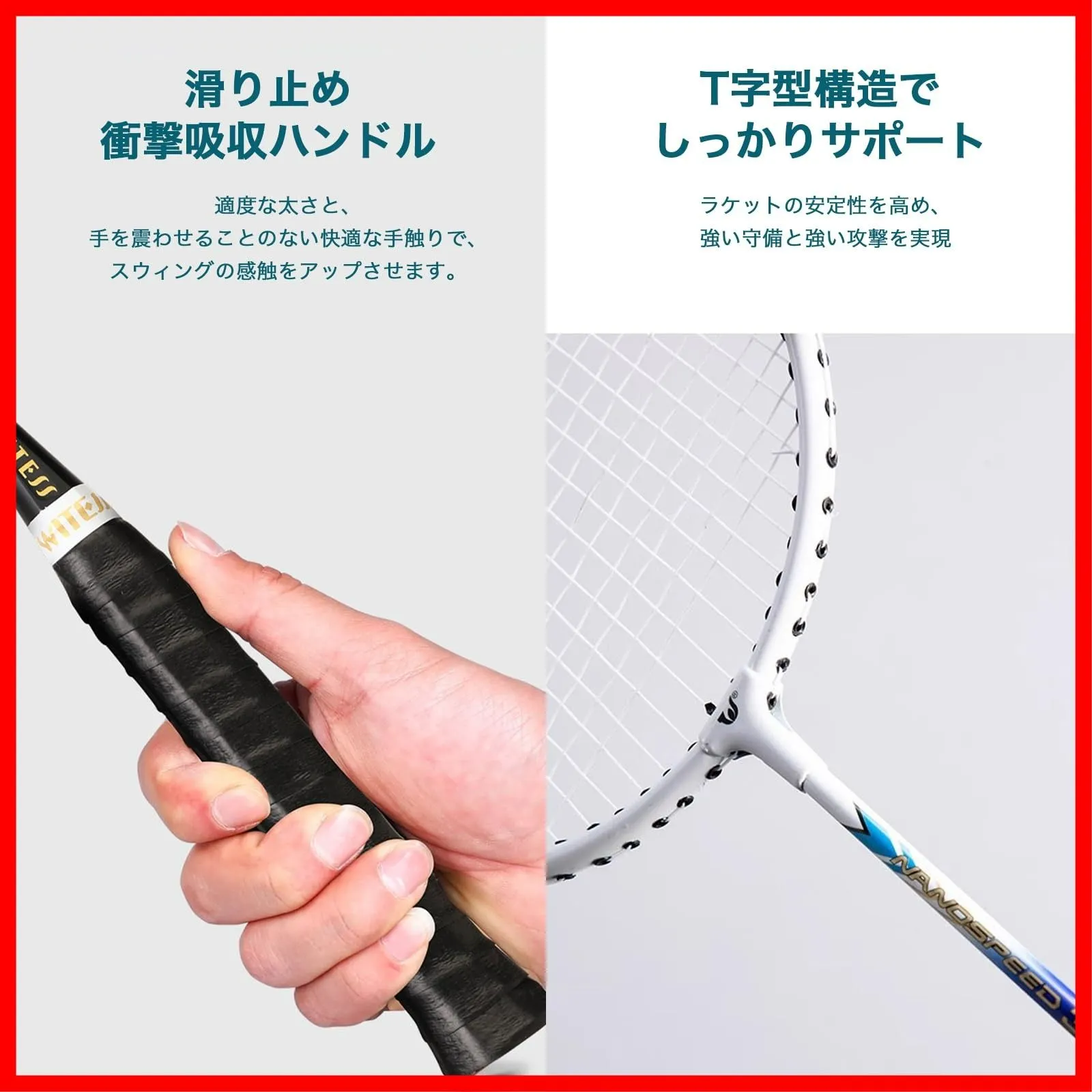 【材料】ラケットは鉄合金製で、1本の重さは約110gです,十分な強度と弾力を備えています。とても軽くて丈夫で初心者向けです。