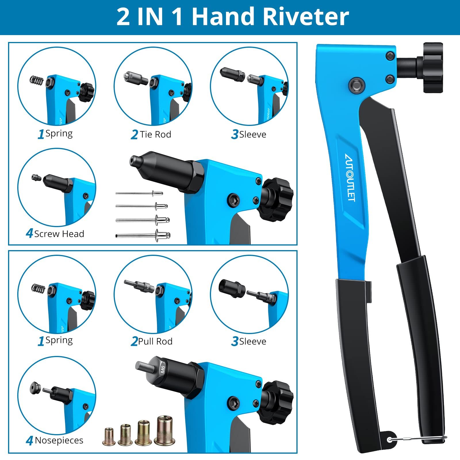 【2-in-1デザイン】AUTOUTLET ワンハンドリベットナットプライヤーとブラインドリベットプライヤーセット、2つの作業領域で使用できます:リベットとナット。これにより、リベットナットプライヤーとブラインドリベットプライヤーの操作がより快適で効率的になります。