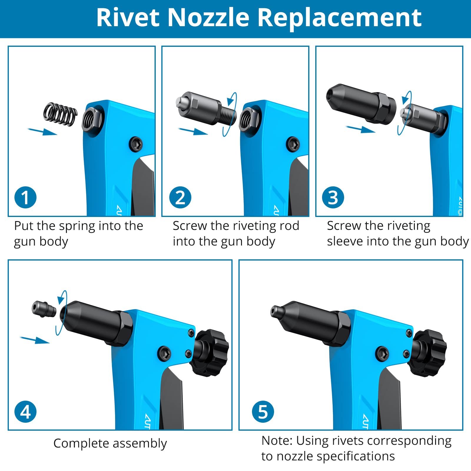 【多機能なアクセサリー】交換可能な4つのメトリック心軸:M3 / M4 / M5 / M6、交換可能な5つのリベットヘッド:2.4mm / 3.2mm / 4.0mm / 4.8mm(注:プライヤーには4.8mmのリベットヘッドが取り付けられているため、ボックス上のスペースは空です。)および多機能スパナが付属しています。