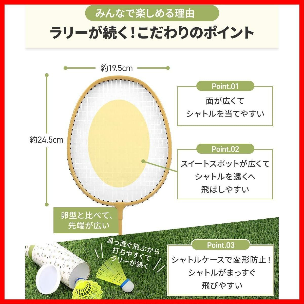 【ラリーが続くための こだわりポイント】 ラケットの面が広くて、シャトルを当てやすい設計。 フレーム形状を工夫して、スイートスポットを広くし、初心者でもシャトルを遠くへ飛ばしやすい! シャトルケース付きで、シャトルの変形を防止。シャトルがまっすぐ飛ぶから、打ちやすくて、ラリーが続きます。