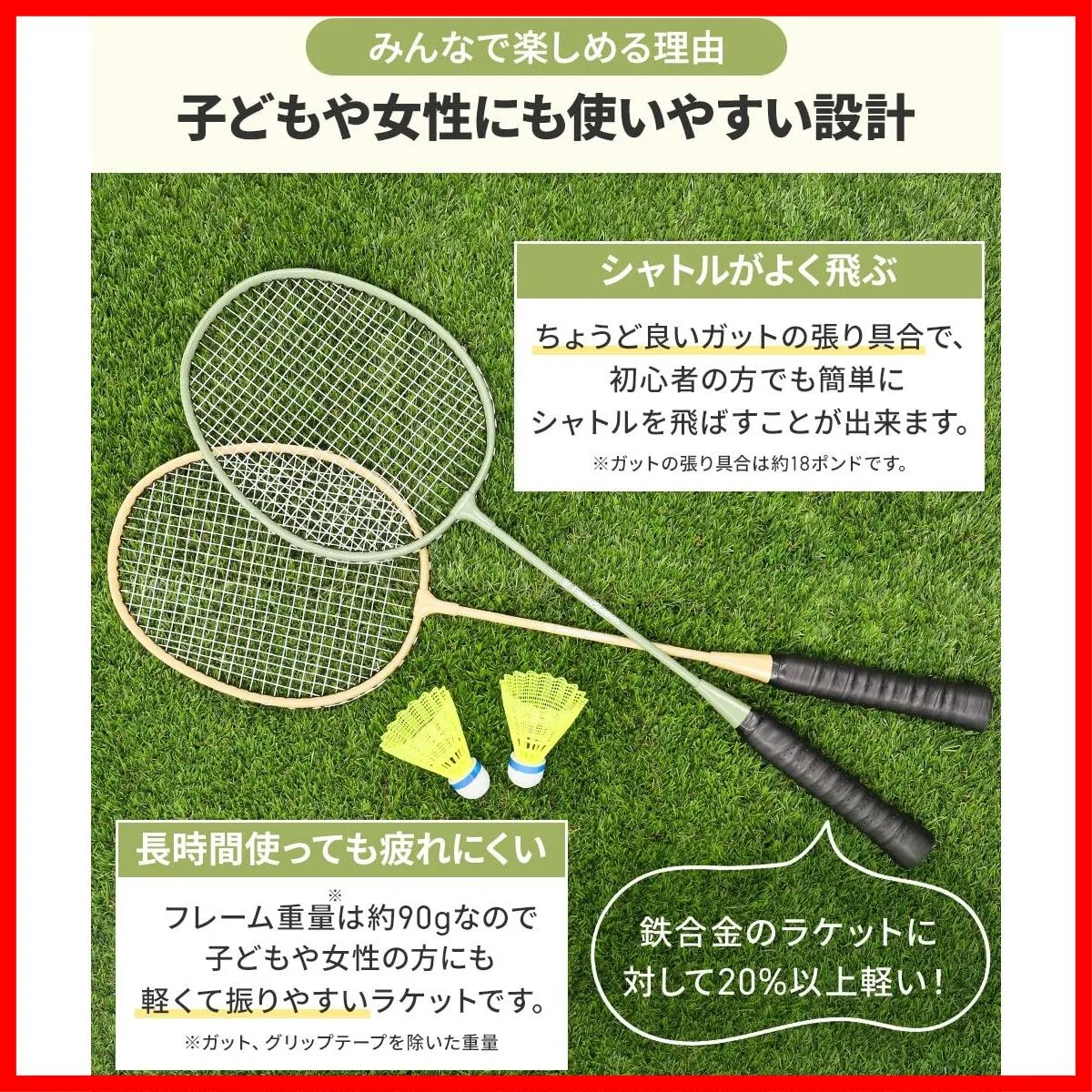 【子どもや女性にも使いやすい】 力のない方や、初心者でもシャトルが飛ばしやすいよう、ガットの張り具合を調整しています。 長時間使っても疲れにくいよう、ラケットフレーム重量を約90gと軽量に!
