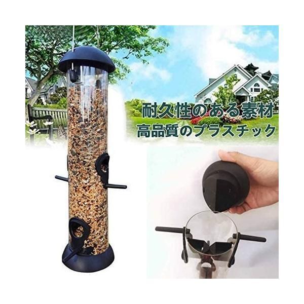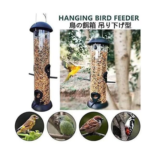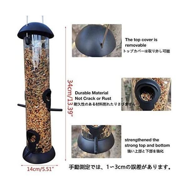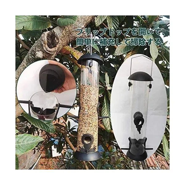 耐久性の高品質素材 :この鳥のフィーダーは高品質の硬質プラスチックでできており、丈夫な上下を強化し、熟成しにくく、丈夫で耐久性があり、長期間使用できます。| 吊り下げ式 ぶら下がっている鳥の餌箱は、鳥の注意を確実にとらえます。鳥に生息させ、種の餌を楽しんでください。あなたはあなたの窓、あなたのデッキまたはパティオから鳥を見ることができました。| 屋外での使用 屋外での使用に非常に適しており、ペットや野鳥に簡単に餌を与えたり、午後にゆっくりと見たりすることができます。| 4つの給餌ポート設計 4つの給餌ポートにより、一度により多くの鳥が給餌できます。ハンガーは、鳥の餌付けスタンド、餌やりステーション、フィーダーフック、木の枝に取り付けることができます。| 充填が簡単、清掃が簡単 上部カバーは取り外し可能で、簡単に補充して掃除する。ドーム型のトップは、鳥の餌付けのために飼料を乾燥して清潔に保つのに役立ちます。オープンフィーダーを使用すると、内部の食品を観察して、時間内に種子を補充できます。定期的な清掃は、より多くの鳥を引き付けるためにフィーダーと種子を清潔に保ちます。||吊り下げ式:|ぶら下がっている鳥の餌箱は、鳥の注意を確実にとらえます。鳥に生息させ、種の餌を楽しんでください。|丈夫な吊り下げ紐は、ベランダの物干し竿や、木の枝などに設置できます。安定感がある造りなので、塀などに置いて使用することもできます。|あなたはあなたの窓、あなたのデッキまたはパティオから鳥を見ることができました。|大容量:|頻繁に補充する必要がありません。|詰め替えの場合は、バックルを解除し、蓋を持ち上げてシードを注ぎます。|充填が簡単、清掃が簡単:|プラスチック製でつけ外しや洗浄などの管理が楽です。|透明なのでえさが外から見やすく、様々な鳥を引き付けて食べることができ、えさの残量を遠くからでも把握可能です。|視界を遮らないので、小鳥の様子も見やすいですよ。|小鳥例: スズメ、メジロ、ウグイス、ツバメ、モズ、シジュウカラ、ヤマガラなど|おすすめの設置場所:庭、山、公園、田畑など|エサ例:ひまわりの種、紅花の種、ピーナッツなど|家にいながらバードウォッチング|鳥たちが好む木陰を作る屋根の下には、強い日差しや雨から身を守り、安定した足場で小鳥が止まりやすい。|窓、ベランダ、テラス、お庭・軒先など家の中から見える位置に吊り下げれば、いつでも鳥を眺めてバードウォッチングを楽しめますよ。|都市部でも、スズメはもちろんウグイス・メジロ・シジュウカラ・ヒヨドリ等、野鳥の観察の場を手軽に得るお手伝いが出来ます。|小鳥の休憩所・避難所としても重宝するでしょう。|寒い冬でも、野鳥はお腹を空かせません。|上部カバーは取り外し可能で、簡単に補充して掃除する。|ドーム型のトップは、鳥の餌付けのために飼料を乾燥して清潔に保つのに役立ちます。|オープンフィーダーを使用すると、内部の食品を観察して、時間内に種子を補充できます。|定期的な清掃は、より多くの鳥を引き付けるためにフィーダーと種子を清潔に保ちます。|4つの給餌ポートにより、一度により多くの鳥が給餌できます。|ハンガーは、鳥の餌付けスタンド、餌やりステーション、フィーダーフック、木の枝に取り付けることができます。|小鳥が爪を立てて立つことができる便利なスタンド。|鳥の爪を傷つけない滑らかな円筒形のスタンド。|小鳥にも簡単に与えることができます。|