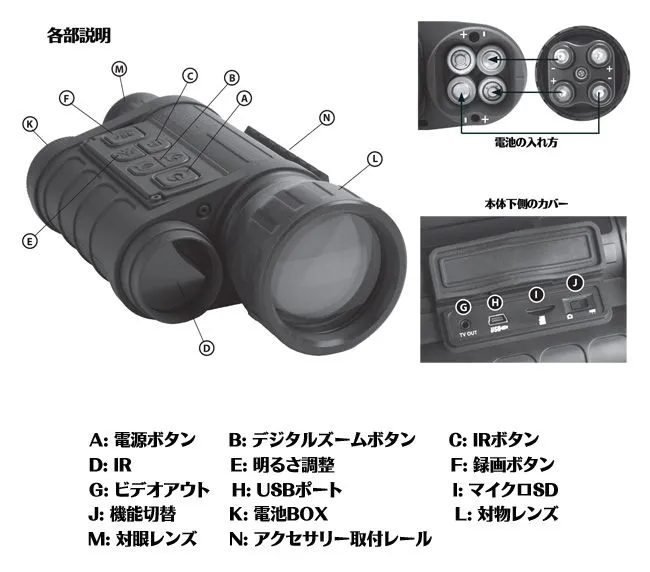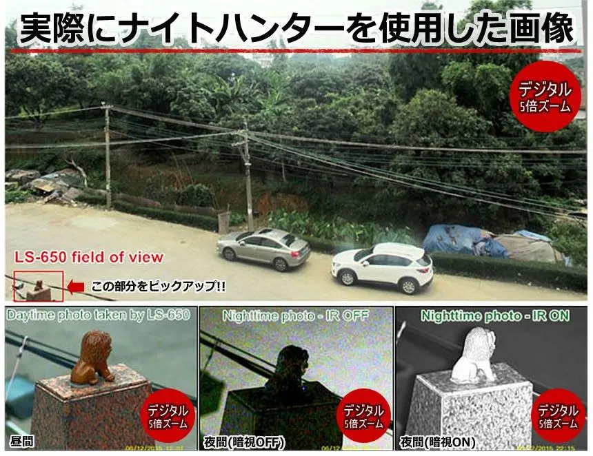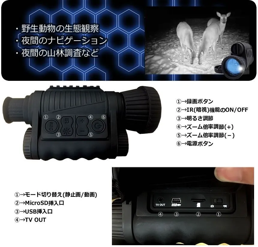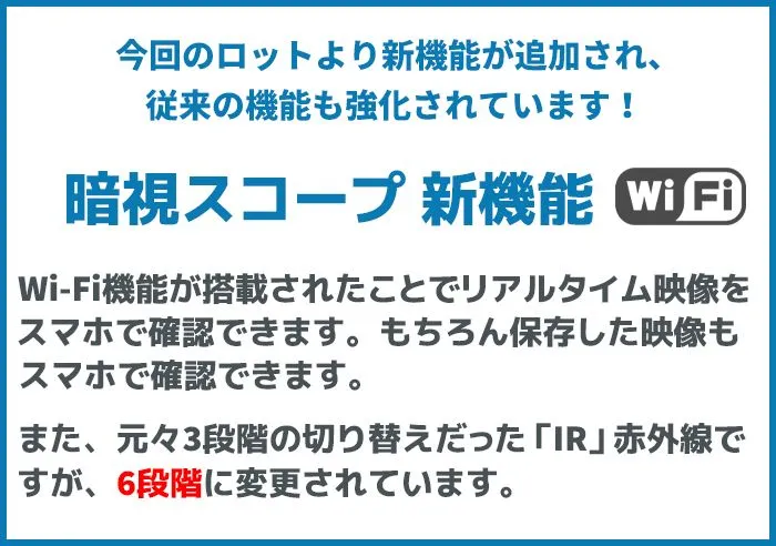 ◆ 今回のロットより新機能が追加され、従来の機能も強化されています。 Wi-Fi機能が搭載されたことでリアルタイム映像をスマホで確認できます。 もちろん保存した映像もスマホで確認できます。 また、元々3段階の切り替えだった「IR」赤外線ですが、6段階に変更されています。 若干でも光源がある場所や近くを見る場合に、IRを作動さすとスポットライトのような光がレンズに映りこみますが故障ではありません。 IRは遠方や真っ暗闇だけで作動すようにすることで池の消耗を最小限に抑えることができます。 暗視スコープ 高性能 ナイトスコープ L-SHINE Wi-Fi 暗視 双眼鏡 LS650 第2.5世代 日本語説明書 望遠鏡 夜間 監視 防災 災害 調査 サバゲー 赤外線 暗視スコープカメラ 単眼鏡 おすすめ