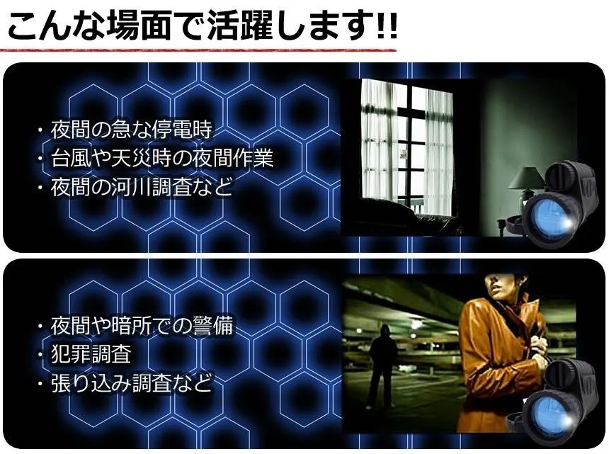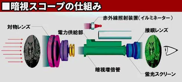 ◆ナイトビジョンとは 元々軍事目的に使用されだしましたが、今では低価格となり探偵業や捜査機関の関係者等様々な分野で使用されています。画像のように対物レンズより取り込んだわずかな光を増幅することで被写体をくっきりと映し出します。また、内蔵のイルミネーター(赤外線照射装置)により全く光が取り込めない真っ暗闇でも使用することができます。
