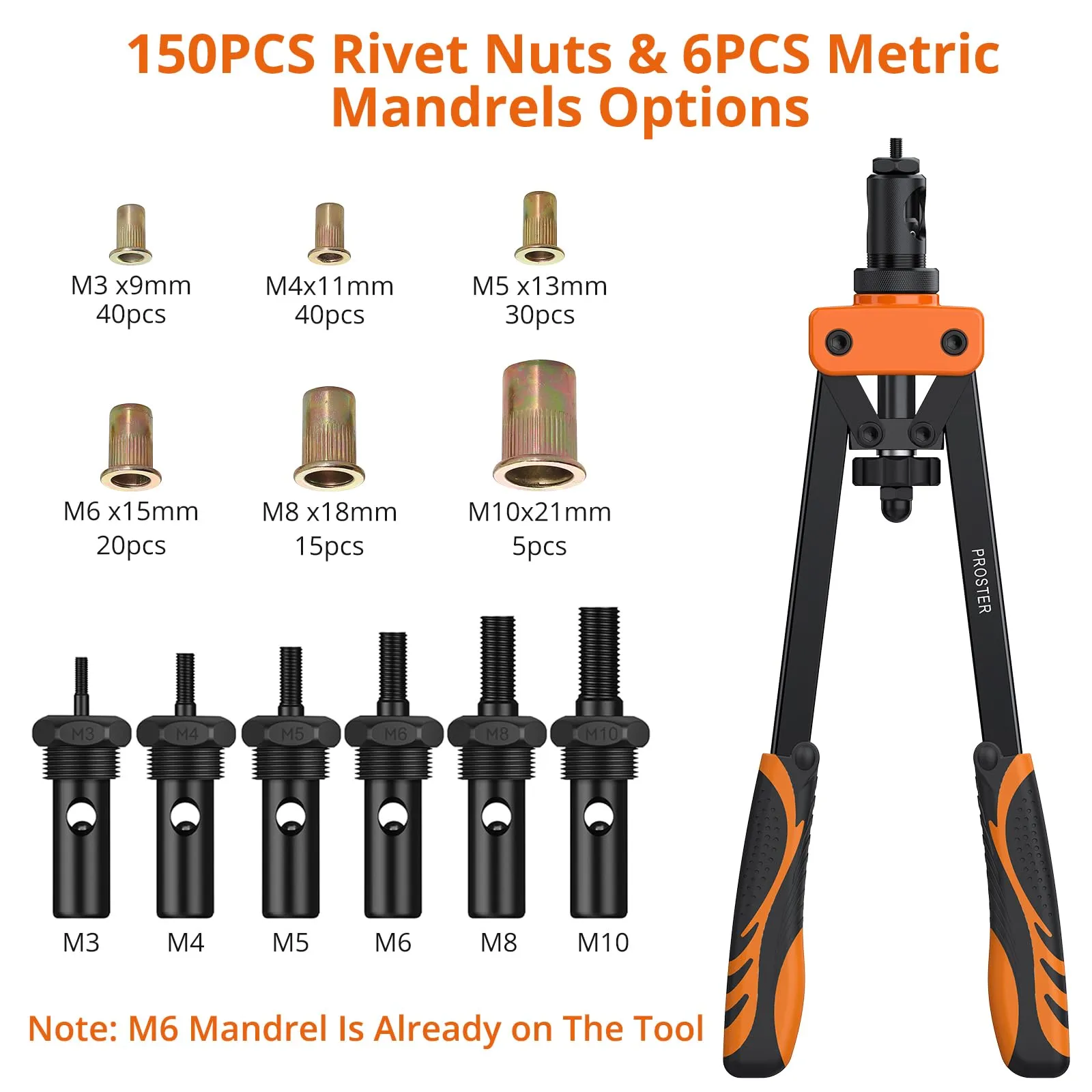 新品 両手式 M3/M4/M5/M6/M8/M10などに対応 ハンドリベッターセット 150pcsリベットナット付属 リベットナッター Proster セット (オレンジ)
