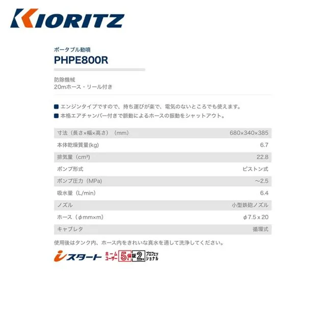 ●本格エアチャンバー付きで脈動によるホースの振動をシャットアウト。 ・寸法(長さ×幅×高さ)(mm)680×340×385 ・本体乾燥質量(kg)6.7 ・排気量(cm3)22.8 ・ポンプ形式ピストン式 ・ポンプ圧力(MPa)~2.5 ・吸水量(L/min)6.4 ・ノズル小型鉄砲ノズル ・ホース(φmm×m)φ7.5x20 ・キャブレタ循環式 使用後はタンク内、ホース内をきれいな真水を通して洗浄してください。 ※北海道・沖縄・離島は別途中継料がかかります。 ※季節商品のため、在庫切れ及びお届けまでお時間いただく場合がございます。お急ぎの場合は在庫確認等お問い合わせください。 個人様宛の大型商品(160サイズ以上)に関しては別途送料が発生します。 法人名をお知らせいただける場合および運送会社のターミナル止めであれば送料はかかりません。 また、北海道、沖縄県、離島は中継料が追加となります。 上記追加送料に関してはお振込等での対応となりますので予めご了承ください。 商品番号:krz-phpe800r_1