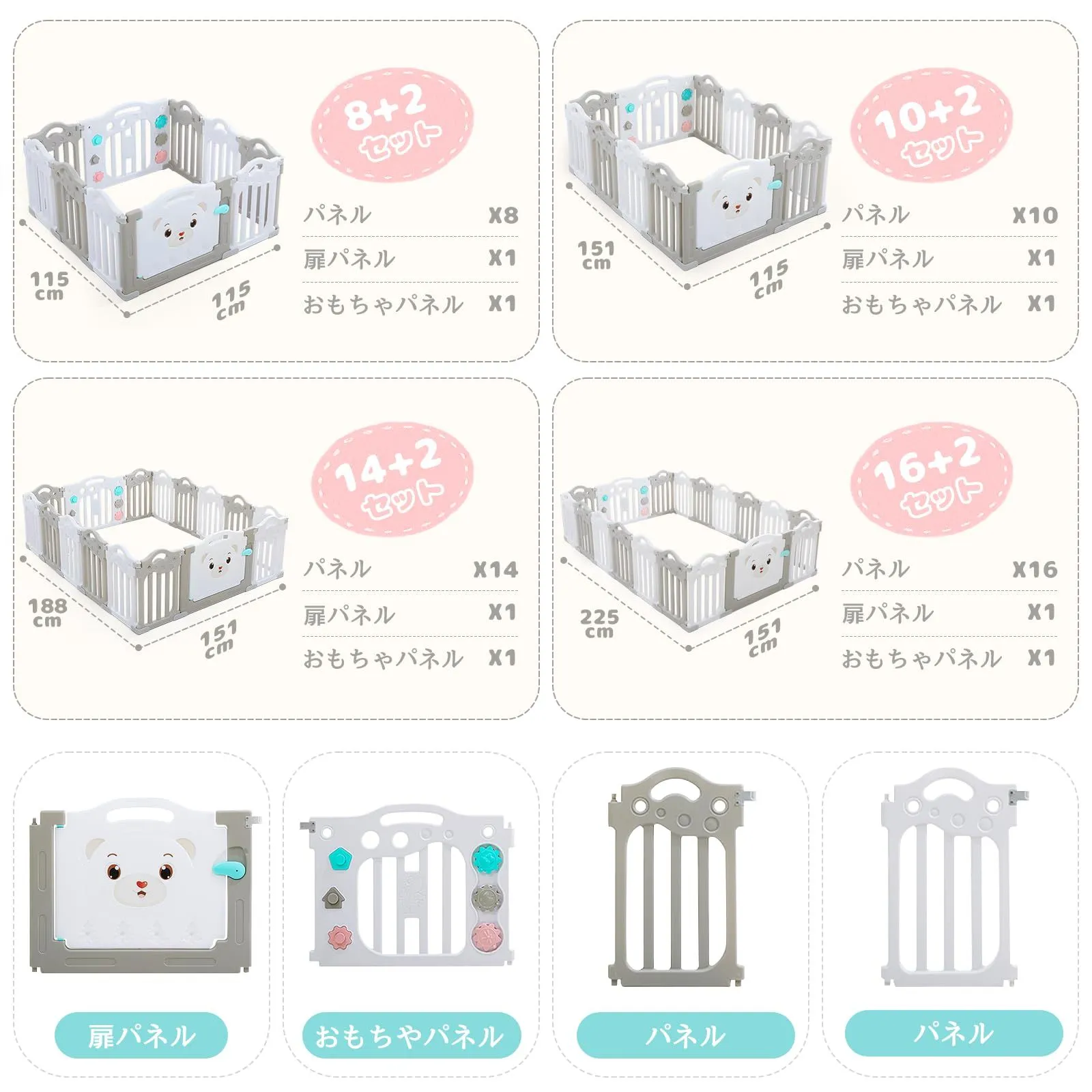 【多サイズ&コンパクト収納】 ベビーサークルは(8+2/10+2/14+2/16+2)の4サイズ展開となっており、折りたたみ可能な設計で収納時も場所を取りません。ドア付きパネル・おもちゃパネルを標準装備し、ご家庭の空間に合わせて最適なサイズをお選びいただけます。特有の収納効率の良さで、外出時も車のトランクにすっきり収納可能でございます。