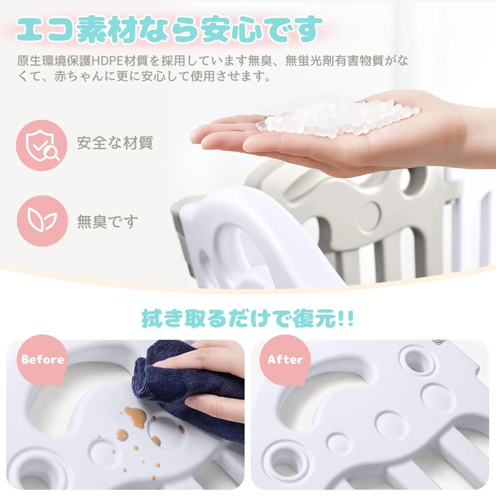【HDPE食品級素材&簡単お手入れ】 HDPE素材を使用した食品基準適合品で、無臭・無蛍光剤・有害物質フリー、お子様が口に入れても安心でございます。お手入れは汚れを拭き取るだけの簡単仕様でございます。赤ちゃん柵としての耐久性と衛生的な管理を両立いたしました。