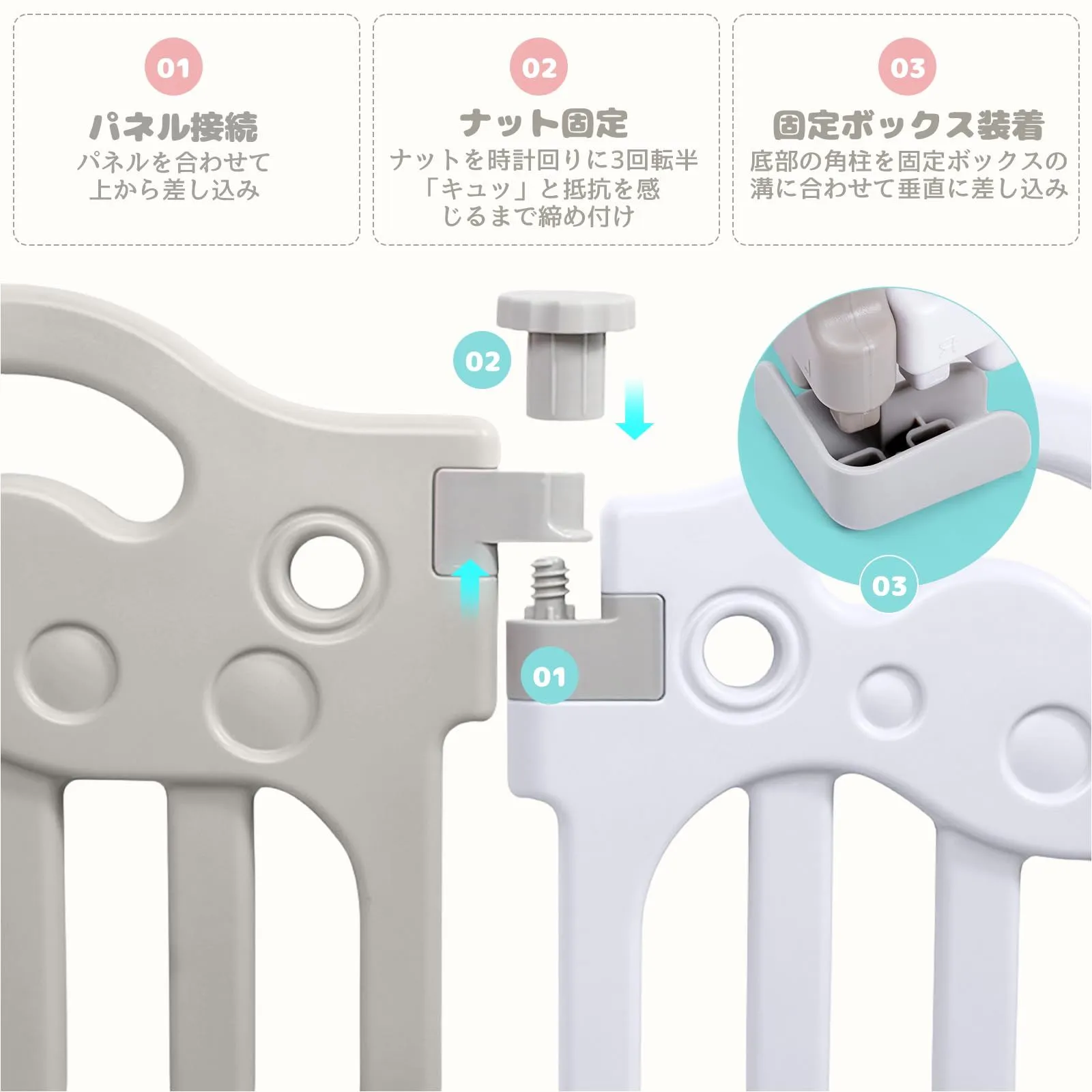 【知育トイ付きゲートデザイン】 6種類の知育トイを搭載したゲートパネルがお子様の成長をサポートします。左側の音鳴りボタンは「ピーピー」と楽しい音で聴覚発達を促し、右側のローラーには動物の浮き彫りが施されており、指先のトレーニングに最適でございます。うちのサークルは、出産祝いやクリスマス・プレゼントなどに喜ばれています!