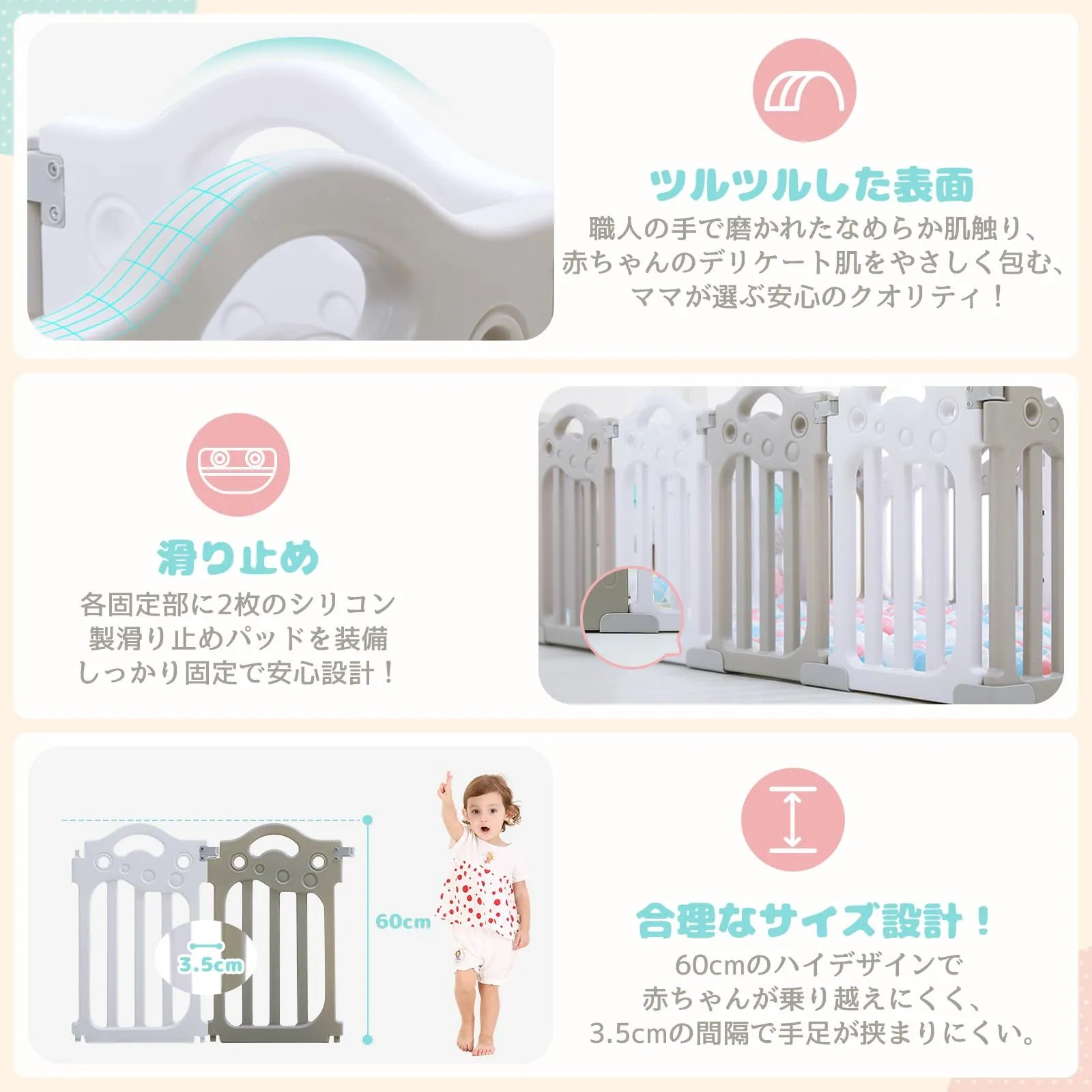 【安全設計3.5cm&60cm高さ】 パネル間の隙間を3.5cmに設計し、お子様の指や足が挟まる心配がございません。60cmのフェンス、赤ちゃんに適した高さ設計で、転倒時の乗り越え防止に効果的です。保護者様が家事をされる間も安心してご利用いただけます。