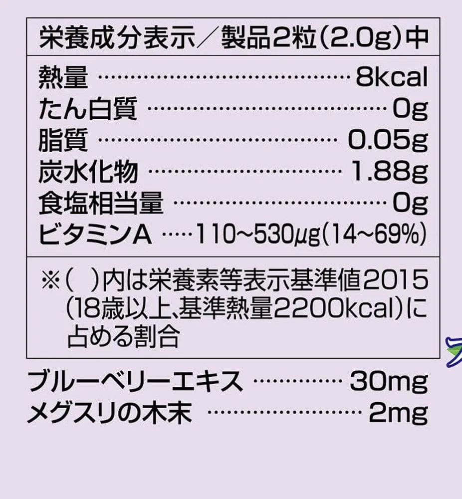 【原材料】 麦芽糖、乳糖、ぶどう糖、ブルーベリーエキス、メグスリの木末、ショ糖エステル、酸味料、V.A、香料、甘味料(スクラロース)