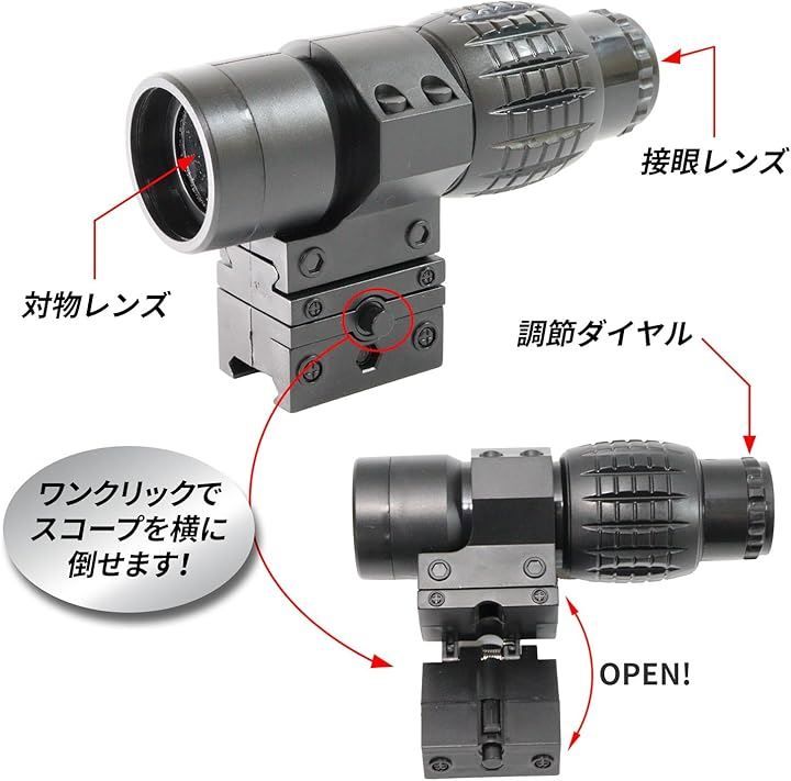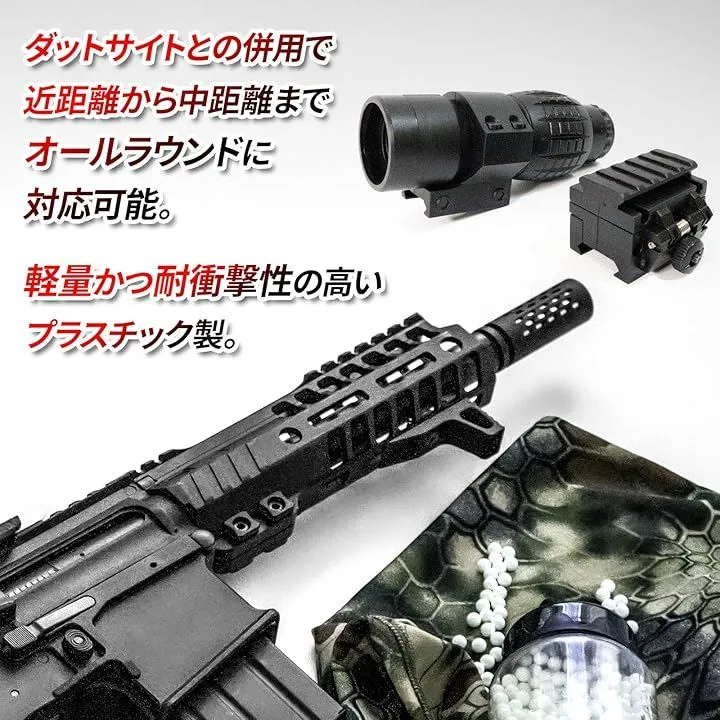 「倍率と使用方法」6倍のスコープとして使用でき、ダットサイトと併用することで、近距離から中距離までオールラウンドに対応可能です。
