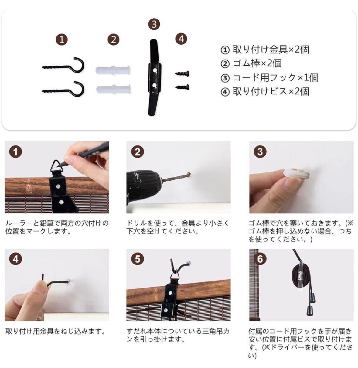 【コートの止め具デザイン】付属のコード用フックを手が届き安い位置に付属ビスで取り付けます。使いやすい高さにひもに止め具をつけます。ブラインドの外側に取り付ける位置を決め、しるしをつけます。お好みの長さになるようにブラインドを引き、ひもを止め具に結び付けます。余ったひもは予備のために保管しておいてください。