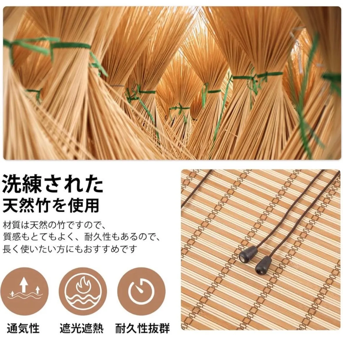 【天然竹素材】天然素材による手作りの竹すだれです。炭火で着色されたナチュラルな風合いが特徴で、和室にマッチする風情のあるデザインのものを使いたい人におすすめ。