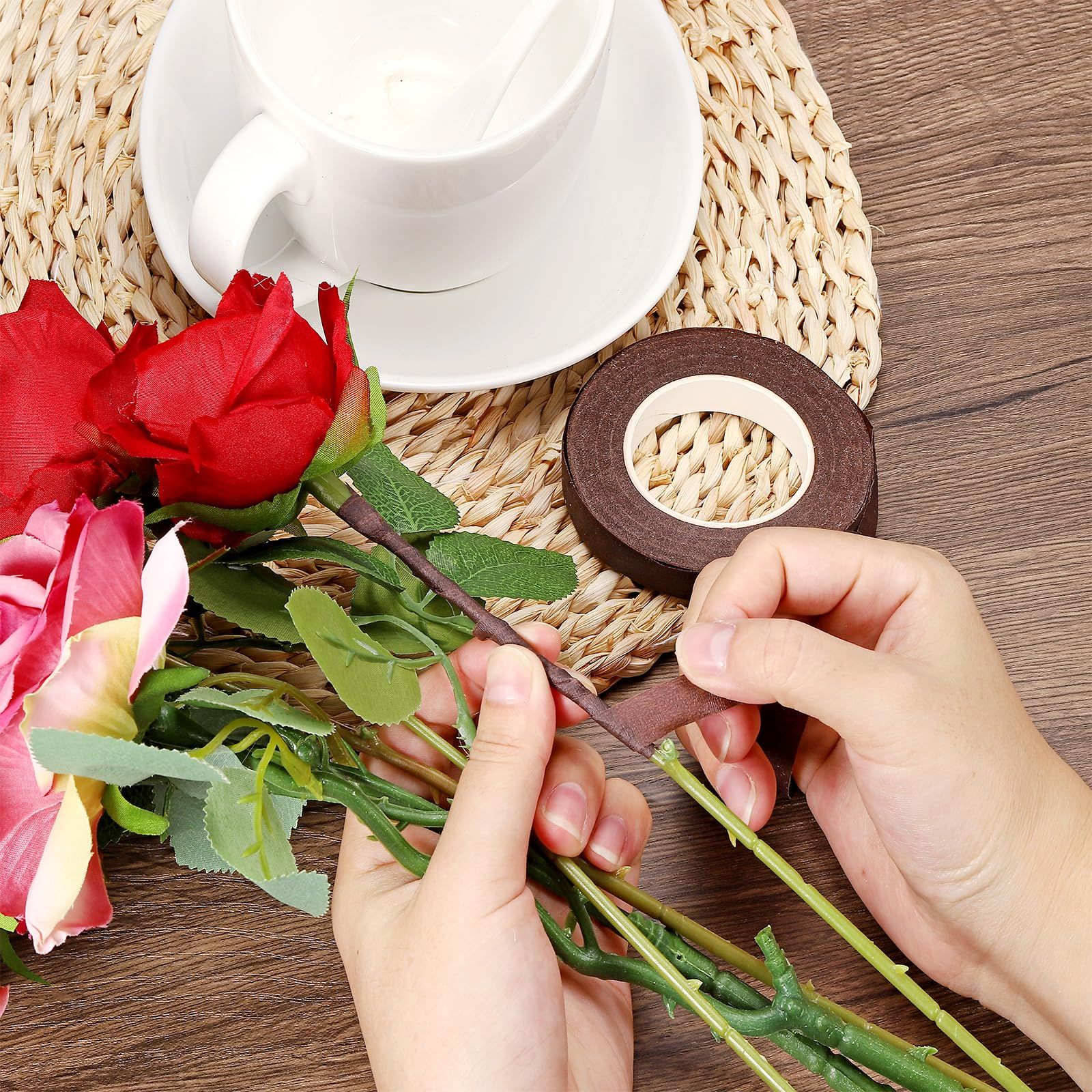 カラー:茶色、材質: クレープ紙、粘着剤、全長: 27 M/30ヤード、幅: 1.2 cm、パッキングリスト:1ロール x フローラルテープ