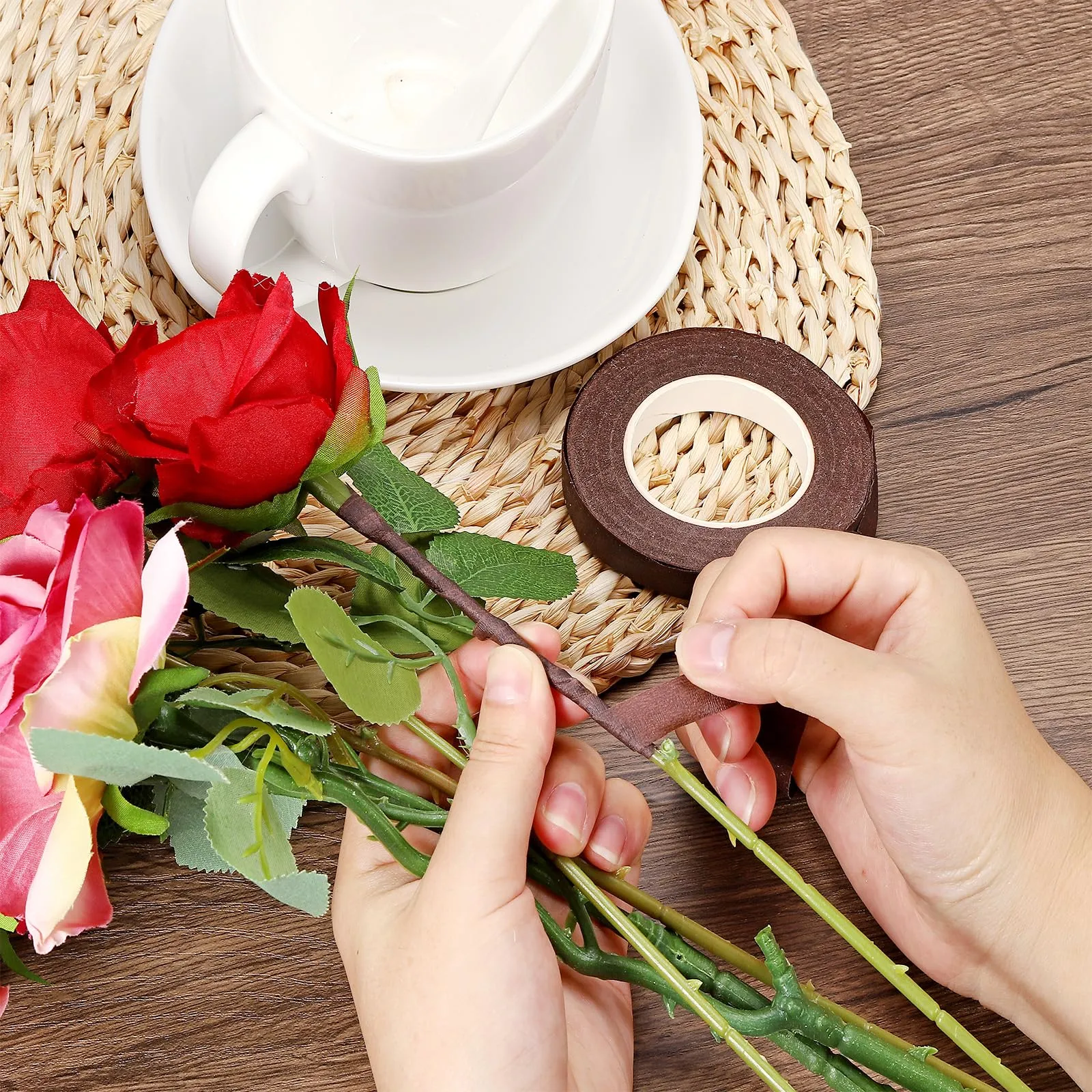 テープにはワックス接着剤が塗られており、使用前に少し伸ばして粘着性を緩めれば、花束の茎を包む準備が整います。
