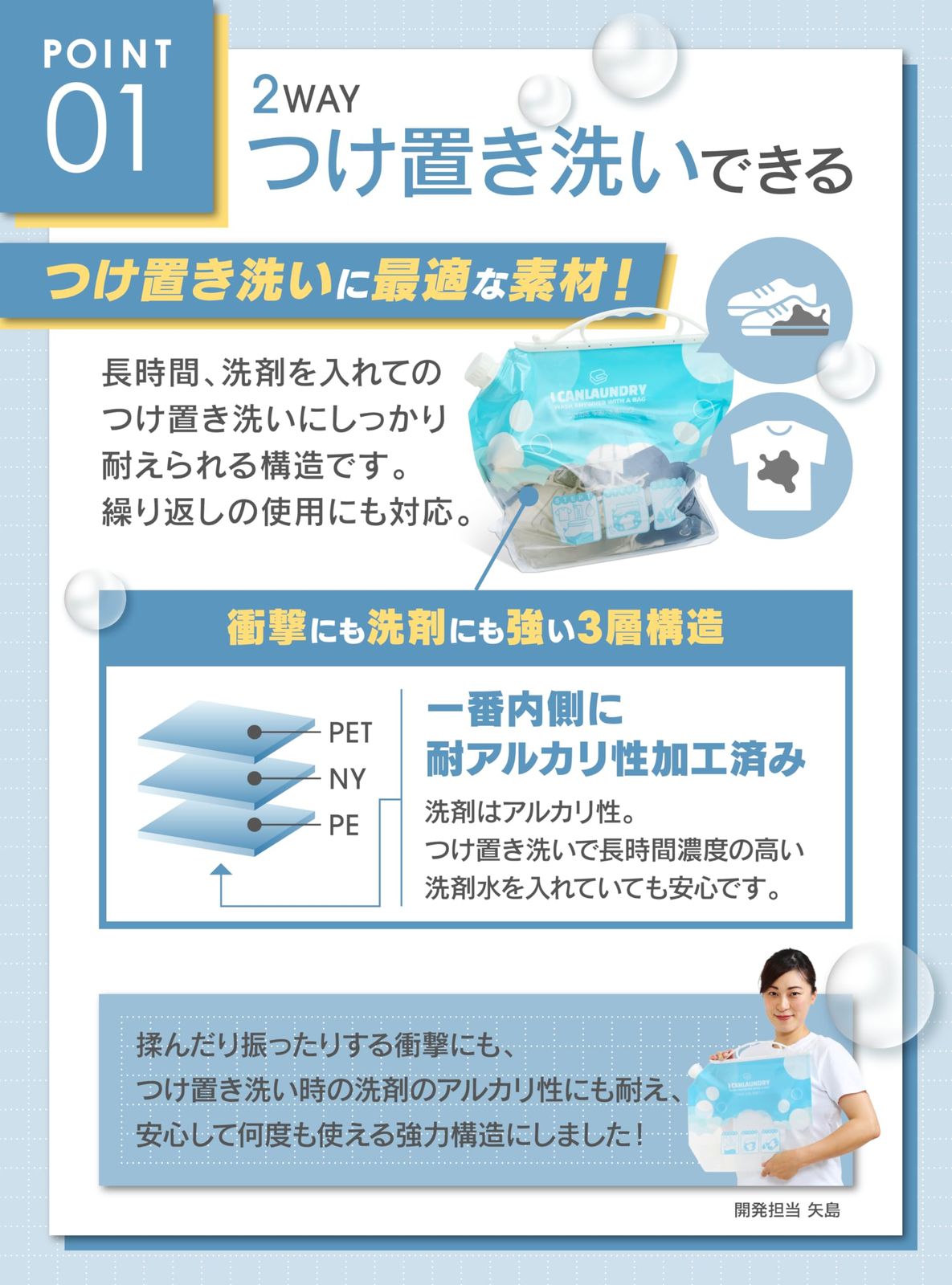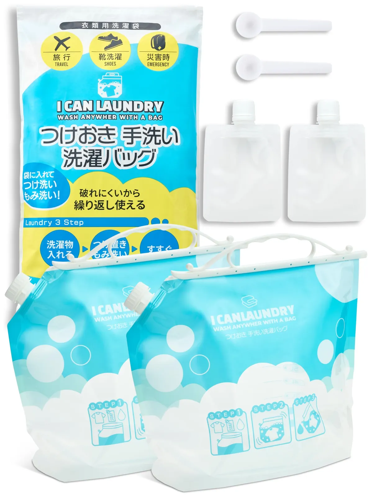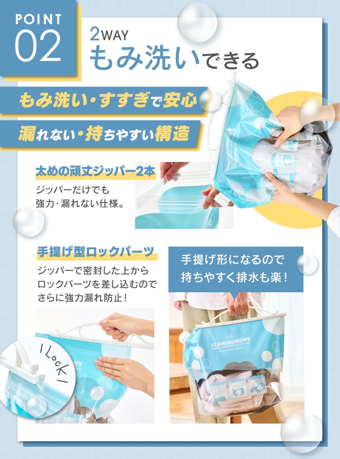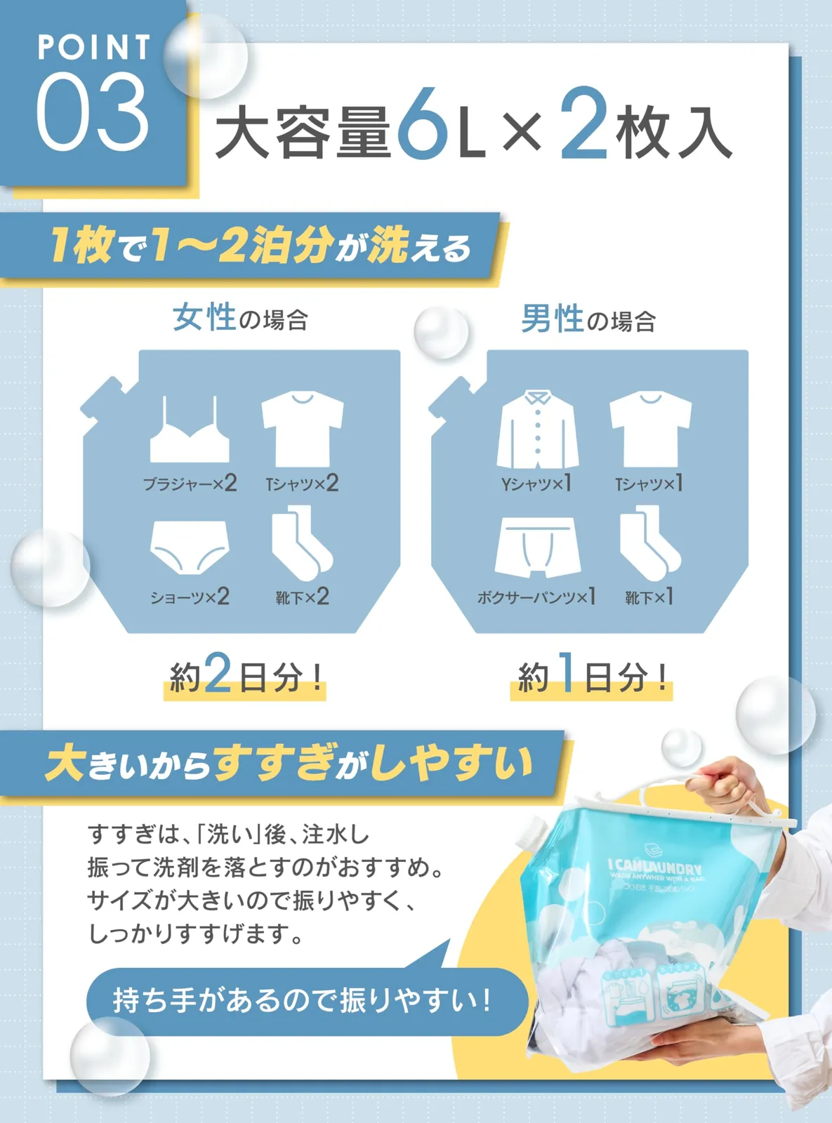 【どこでも“手洗い洗濯”ができる洗たく袋】 旅先やホテル、ちょっとした外出先でも便利! 水と洗剤を入れて振るだけのかんたん手洗い洗濯袋。 洗濯機が使えないときの“頼れるアイテム”