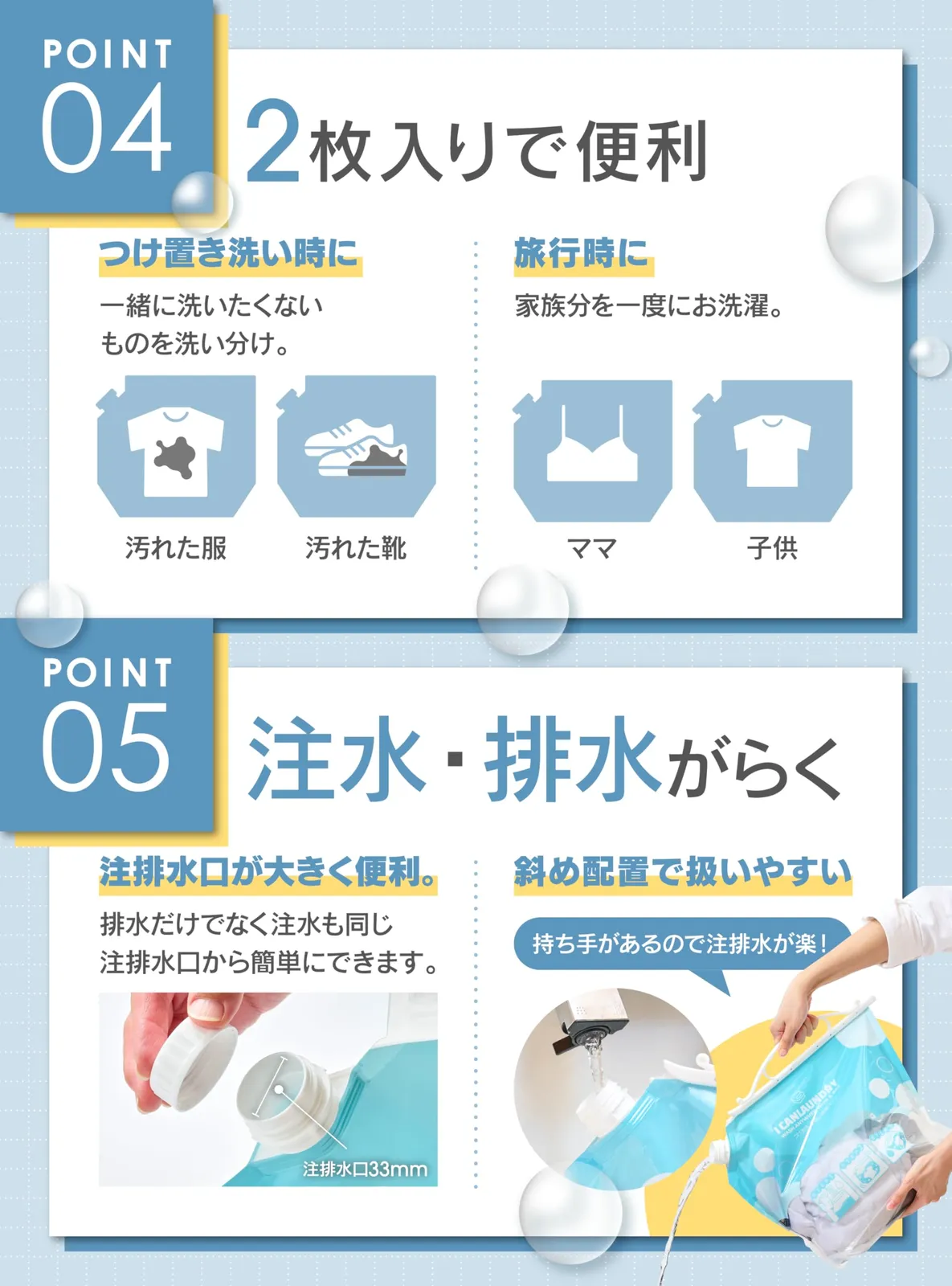 【2枚セットで分け洗いに便利】 下着と服・お子様と大人の衣類など、使い分けたい時に便利な2枚入り。 コンパクトに畳めるので、トラベルグッズやサブ洗濯道具としてもぴったり。