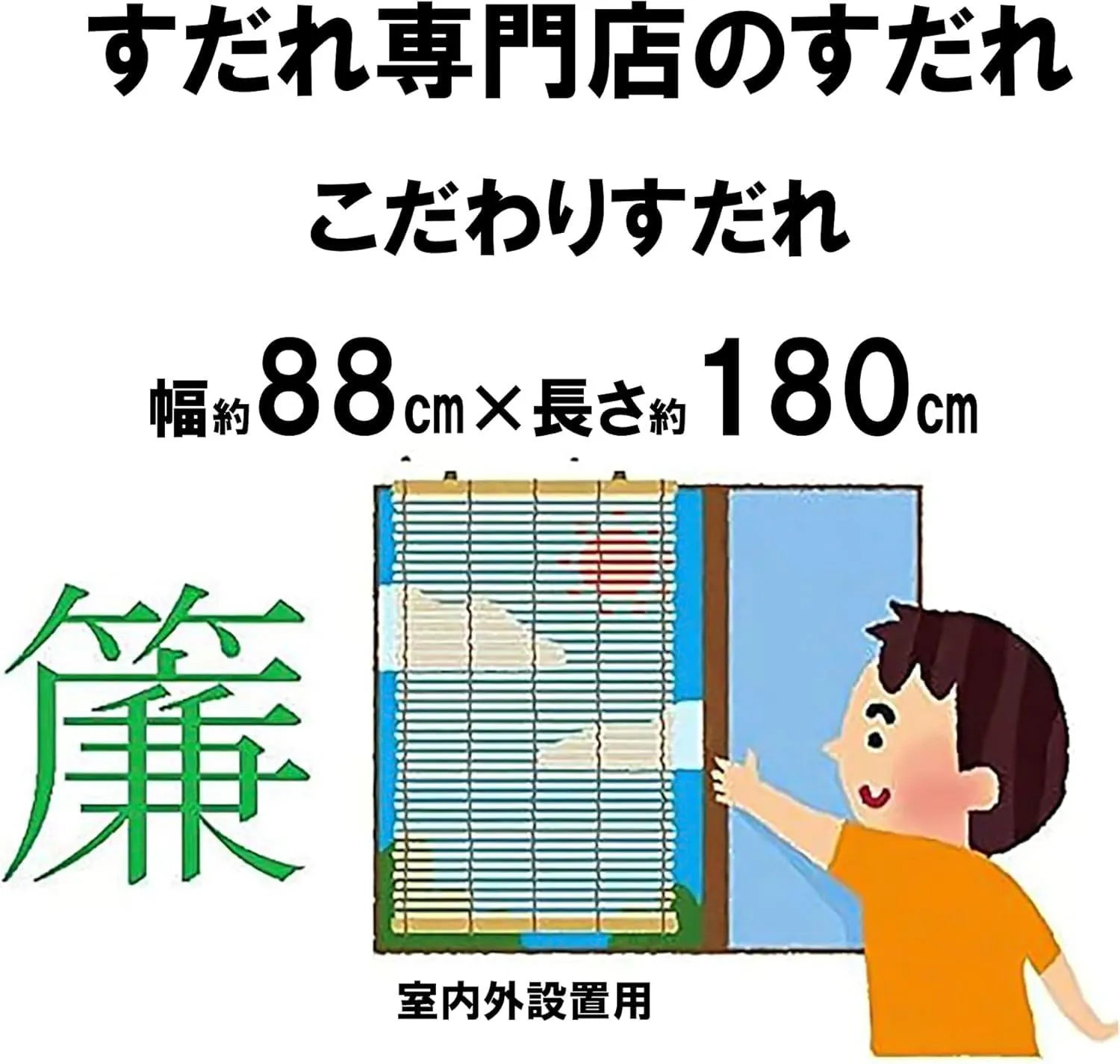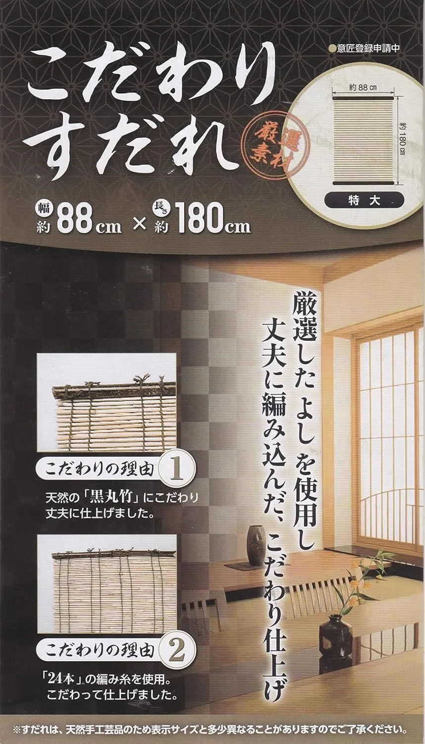 天然の黒丸竹にこだわり、上下に用いて丈夫に仕上げました。厳選された天然よしを24本の糸でしっかりと編み上げて、丈夫に仕上げました。従来の天津すだれより耐久性に優れたこだわりのすだれです。日ざしを遮り、自然の風を取り込み、部屋を涼しくします。外からの視線を遮ります。巾サイズは、半間88cmサイズ。天然手工芸品の為、多少の折れやささくれ、色むらなどがある場合がございます。天然手工芸品の為、表示サイズと多少異なる場合がございます。