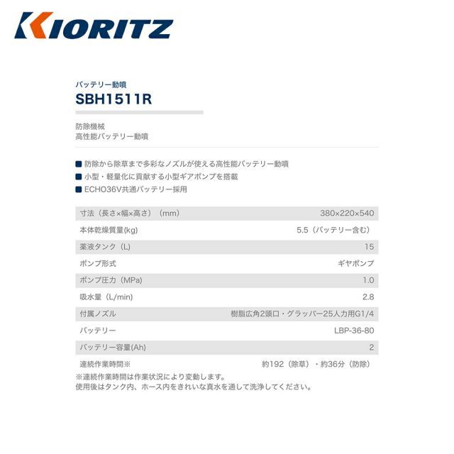 ●ECHO36V共通バッテリー採用 ・寸法(長さ×幅×高さ)(mm)380×220×540 ・本体乾燥質量(kg)5.5(バッテリー含む) ・薬液タンク(L)15 ・ポンプ形式ギヤポンプ ・ポンプ圧力(MPa)1.0 ・吸水量(L/min)2.8 ・付属ノズル樹脂広角2頭口・グラッパー25人力用G1/4 ・バッテリーLBP-36-80 ・バッテリー容量(Ah)2 ・連続作業時間※約192(除草)・約36分(防除) ※連続作業時間は作業状況により変動します。 使用後はタンク内、ホース内をきれいな真水を通して洗浄してください。 ※北海道・沖縄・離島は別途中継料がかかります。 ※季節商品のため、在庫切れ及びお届けまでお時間いただく場合がございます。お急ぎの場合は在庫確認等お問い合わせください。 商品番号:krz-sbh1511r