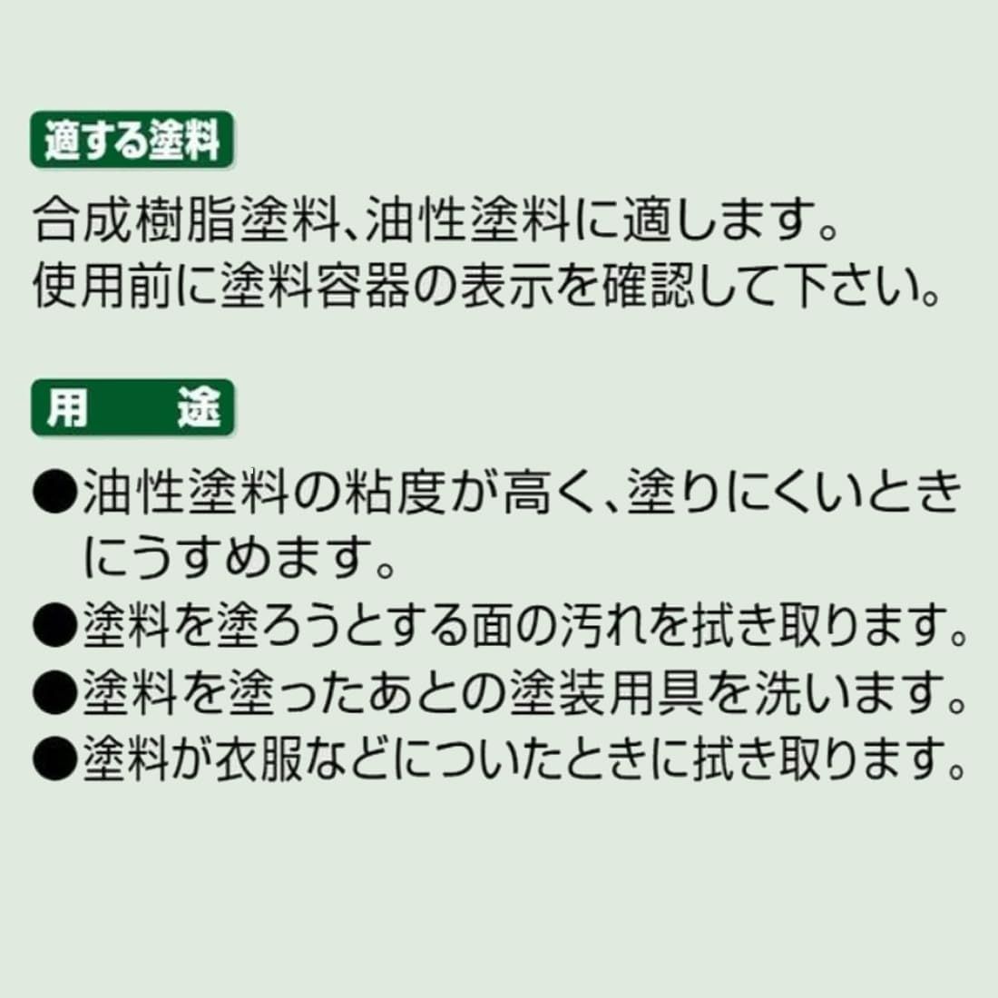 用途:油性塗料の粘度が高く、塗りにくいときの希釈に。塗料を塗ろうとする面のよごれのふきとりに。塗料を塗ったあとの塗装用具の洗浄に。塗料が衣服などについたときのふきとりに。