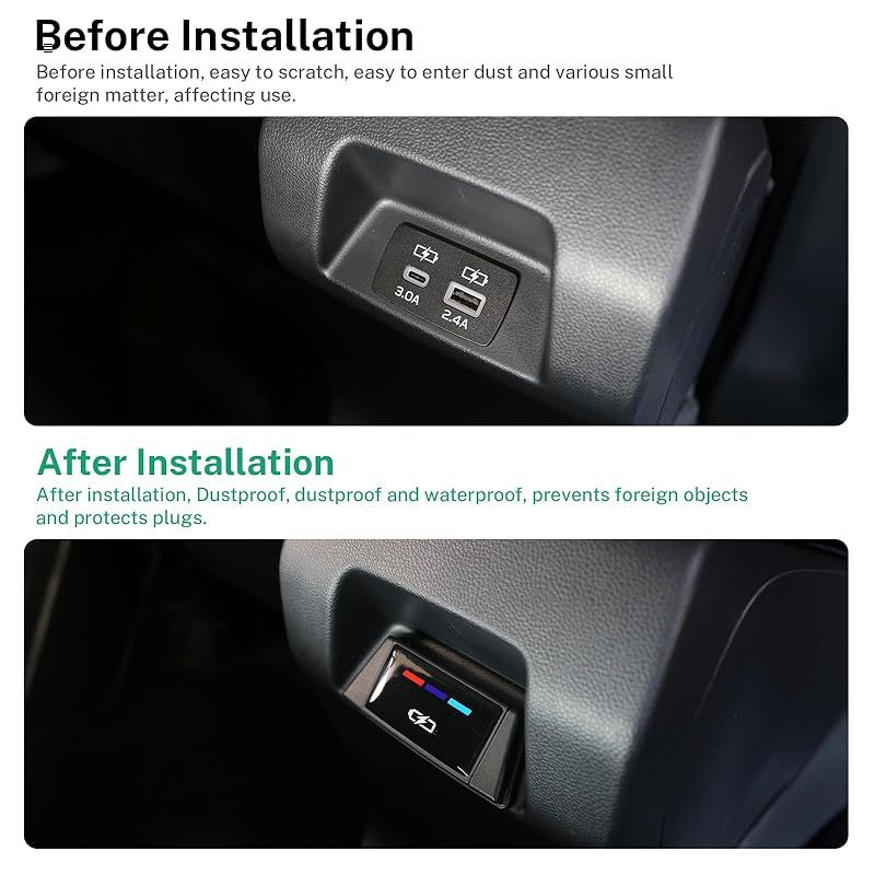 【実用性】 :後ろの席は見落としがちなところです。長い年月が経つと、細かいところにほこりが落ちやすくなります。これでほこりの心配はなくなりました。簡単に取り付けられ、USBポートが空気中に露出しなくなり、ほこりの心配もなくなります。