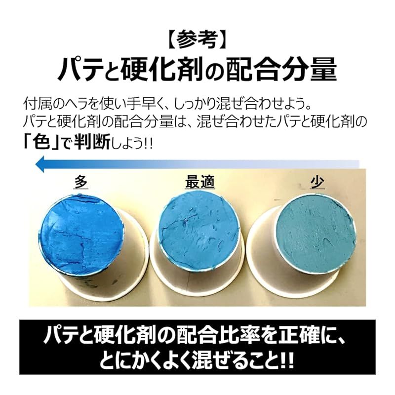 ●色調パテ=ライトグレー、硬化剤=ブルー、硬化後色=ライトブルー