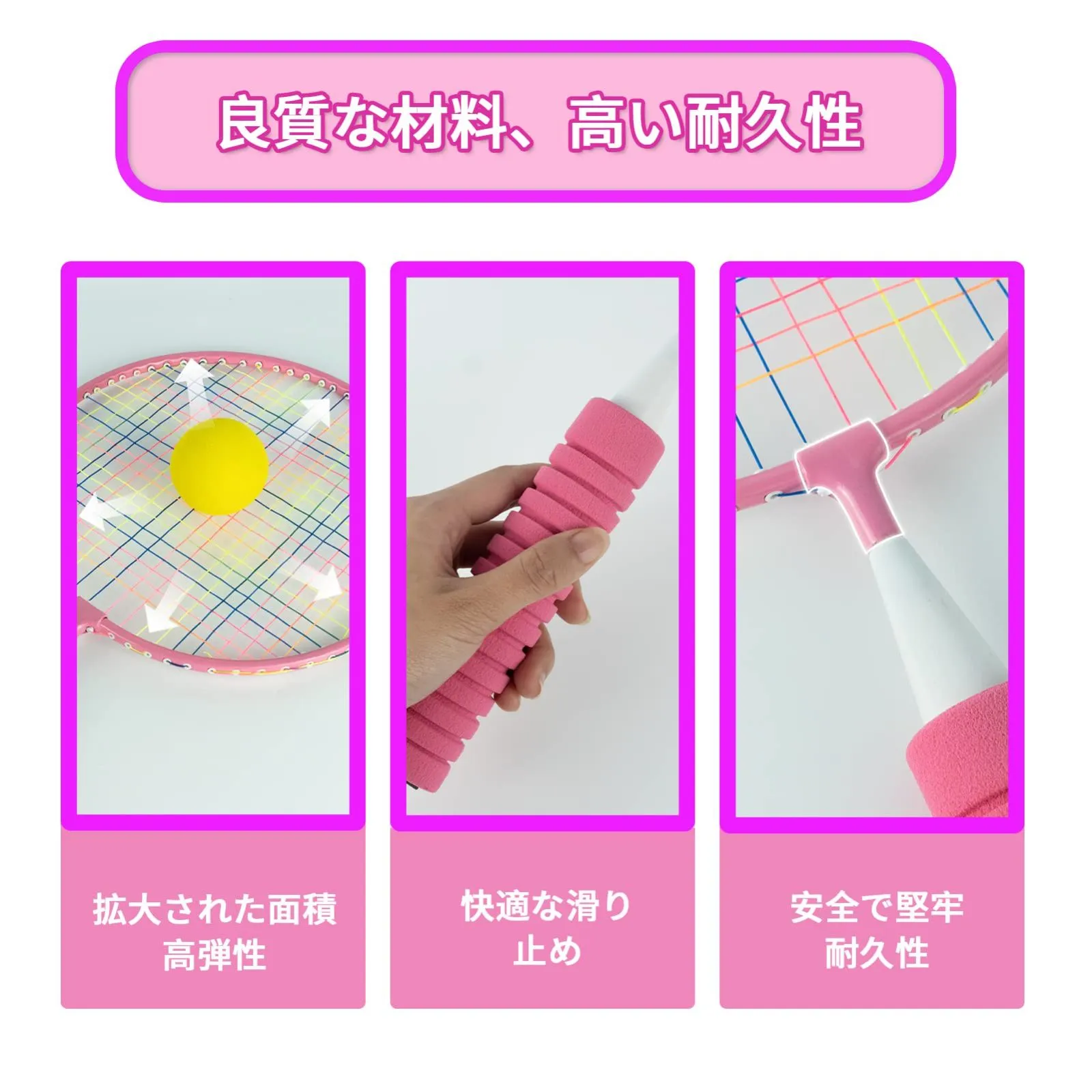 【アルミニウム合金フレーム】耐久性のあるアルミニウム合金素材を使用しており、その他のラケットより軽く、軽量と耐久性の2つの特長を兼ね備えている。子どもにより使いやすい設計になっています。