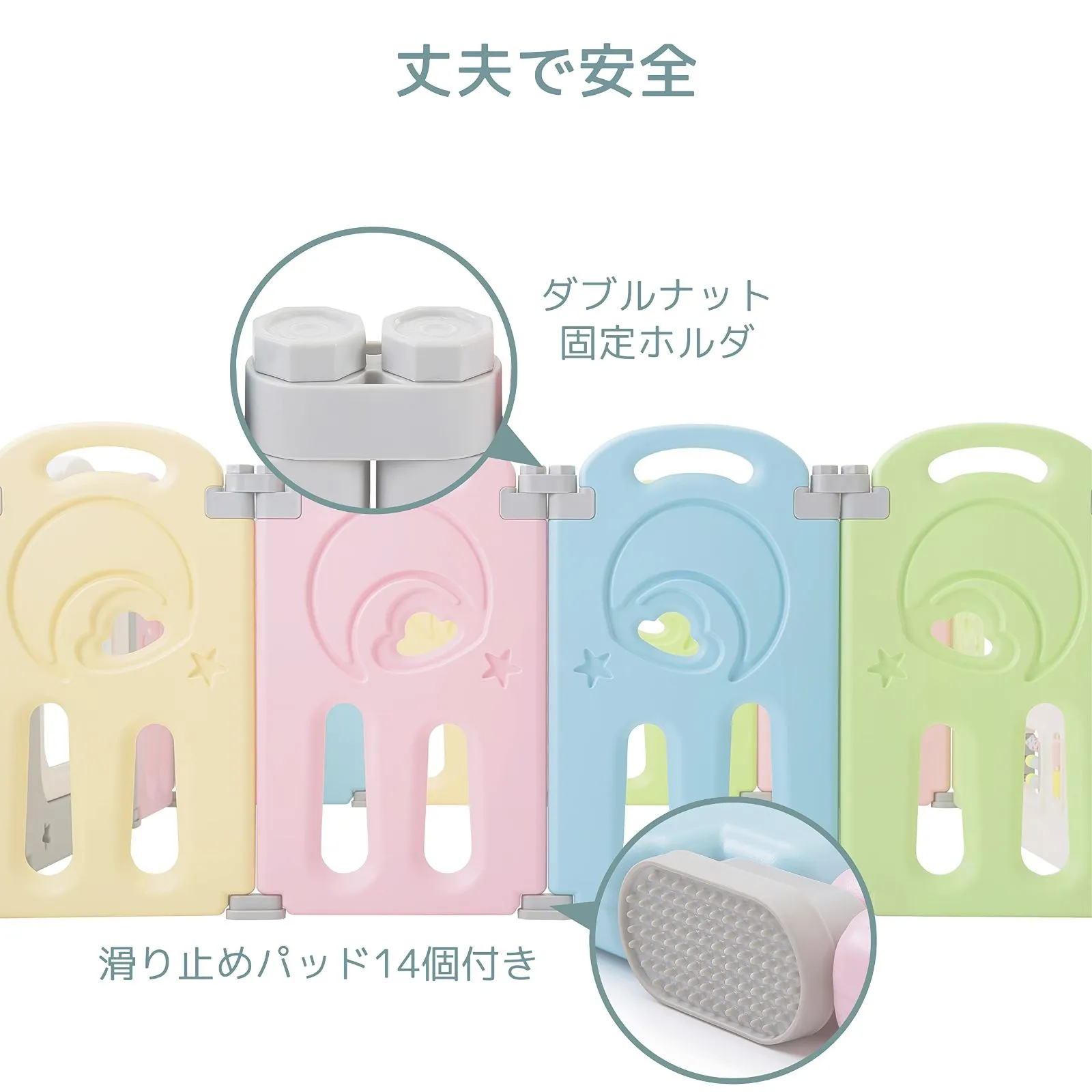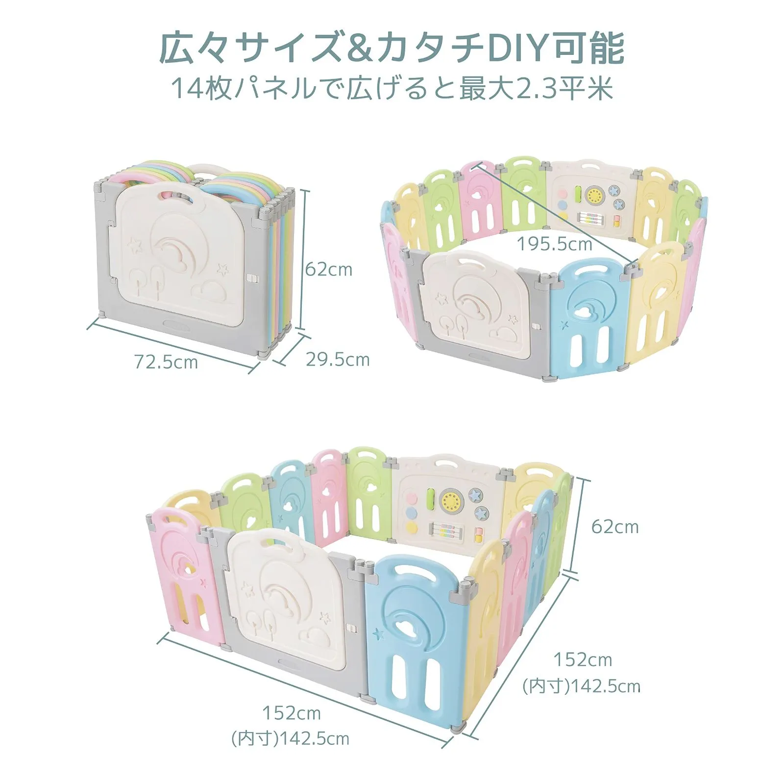 『在庫処分』 プレゼント 子供ゲート プレイヤード キッズパーテーション 出産祝い ベビーフェンス 組立簡単 ドア付き おもちゃパネル 高さ62cm マルチカラー サークル 赤ちゃん 大きめ 人気 折畳み 14枚セット ベビーサークル Castle Cloud