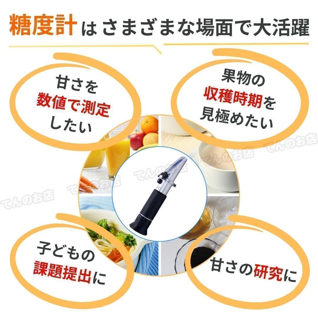 ■果実・野菜 ・フルーツ専用設計ブドウ、トマト、イチゴ、メロン、スイカ、モモなどの糖度を測定できます。 家庭菜園や農業での収穫タイミングの判断はもちろん、買ってきた果物の糖度チェックや、健康管理にも便利です。 (ハチミツなどの糖度の高いものには適しません)