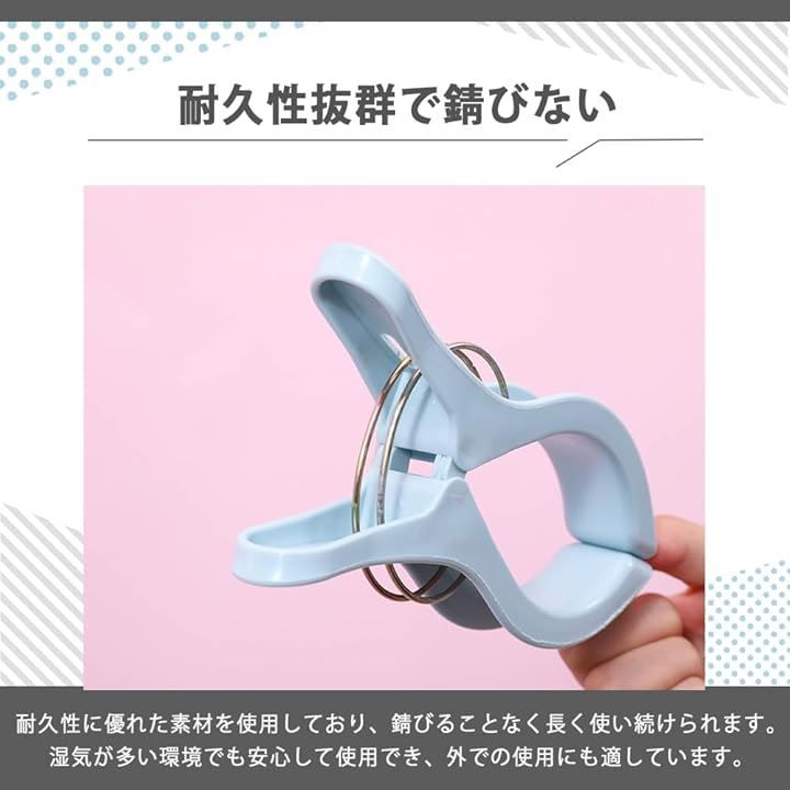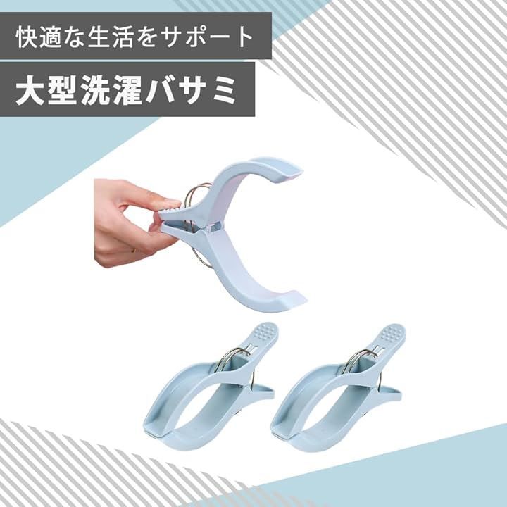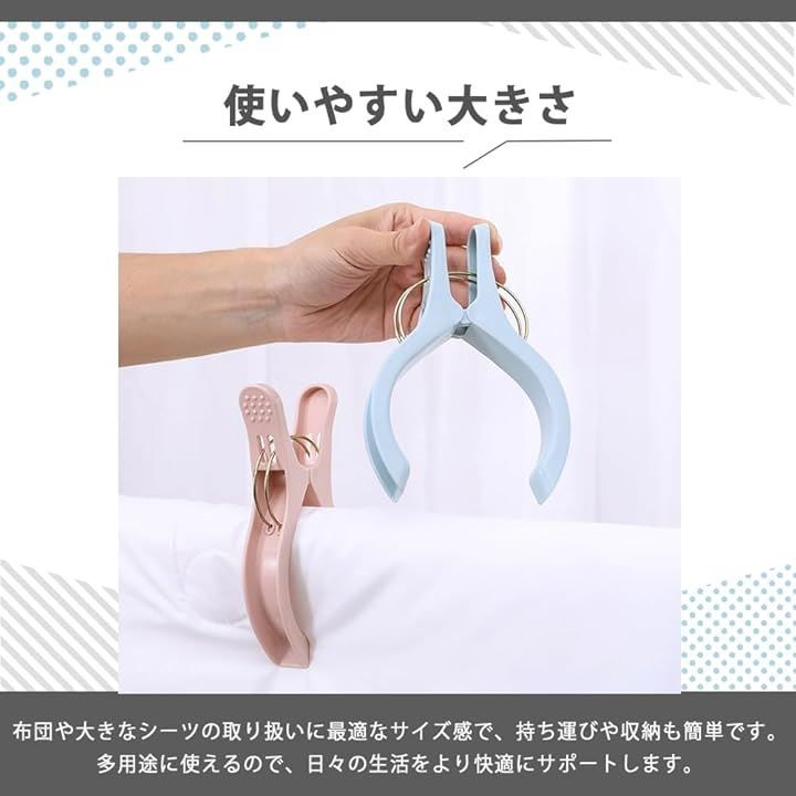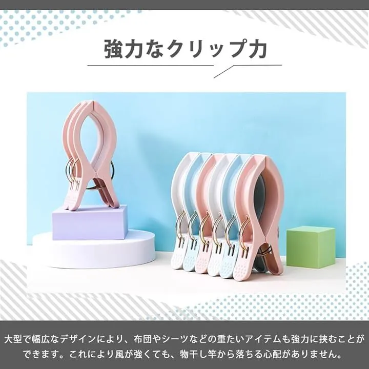 「強力なクリップ力」大型で幅広なデザインにより、布団やシーツなどの重たいアイテムも強力に挟むことができます。