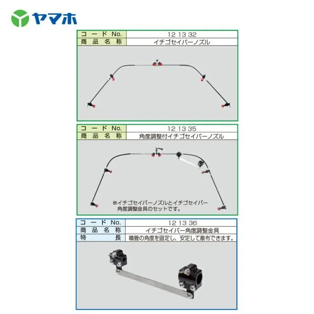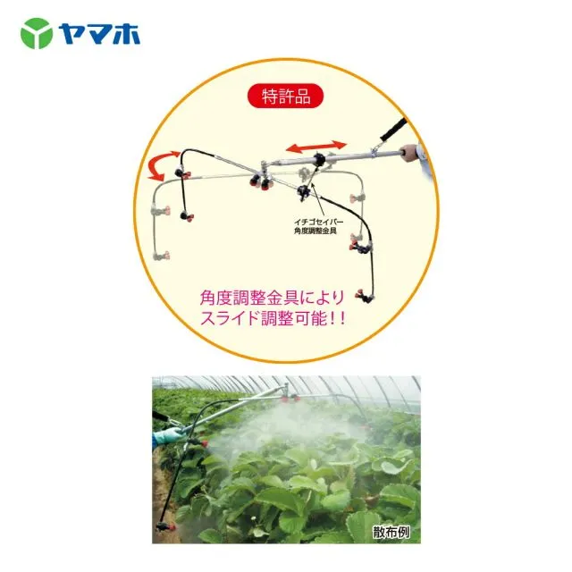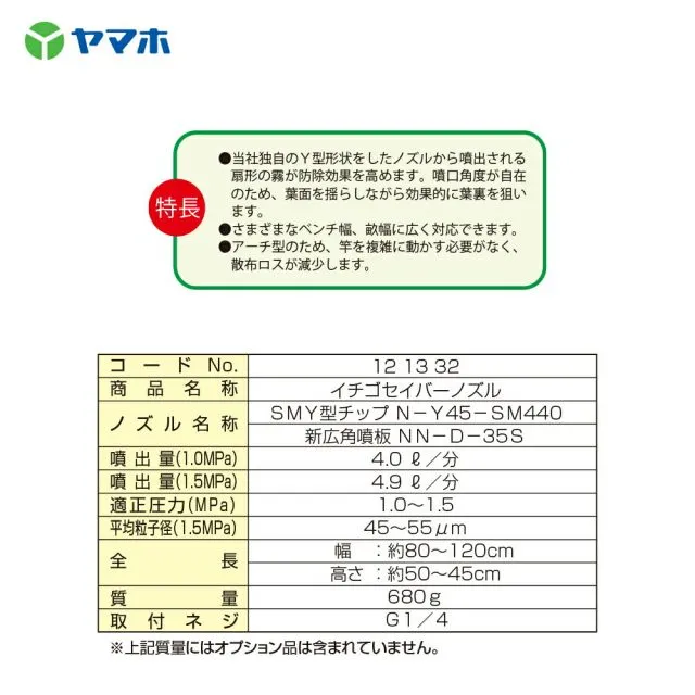 ●アーチ型のため、竿を複雑に動かす必要がなく、散布ロスが減少します。 ・コードNo:121332 ・商品名:イチゴセイバーノズル ・ノズル名称:SMY型チップN-Y45-SM440/新広角噴板NN-D-35S ・噴出量(1.0MPa):4.0L/分 ・噴出量(1.5MPa):4.9L/分 ・適正圧力(MPa):1.0~1.5 ・平均粒子径(1.5MPa):45~55μm ・全長:幅:約80~120cm ・全長:高さ:約50~45cm ・質量:680g ・取付ネジ:G1/4 ※北海道・沖縄・離島は別途中継料がかかります。 ※季節商品のため、在庫切れ及びお届けまでお時間いただく場合がございます。お急ぎの場合は在庫確認等お問い合わせください。 商品番号:yho-121332
