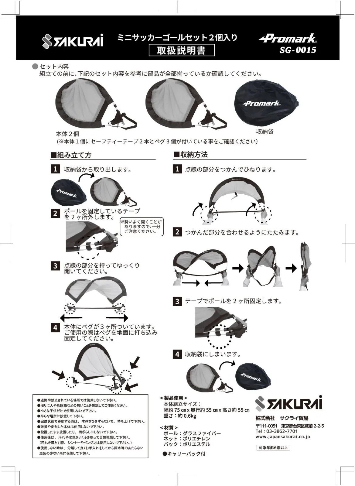 【数量限定】SG-0015 キャリーバック付 2個入り プレゼント ミニゴールセット ゴール サッカー Promark(プロマーク) サクライ貿易(SAKURAI)