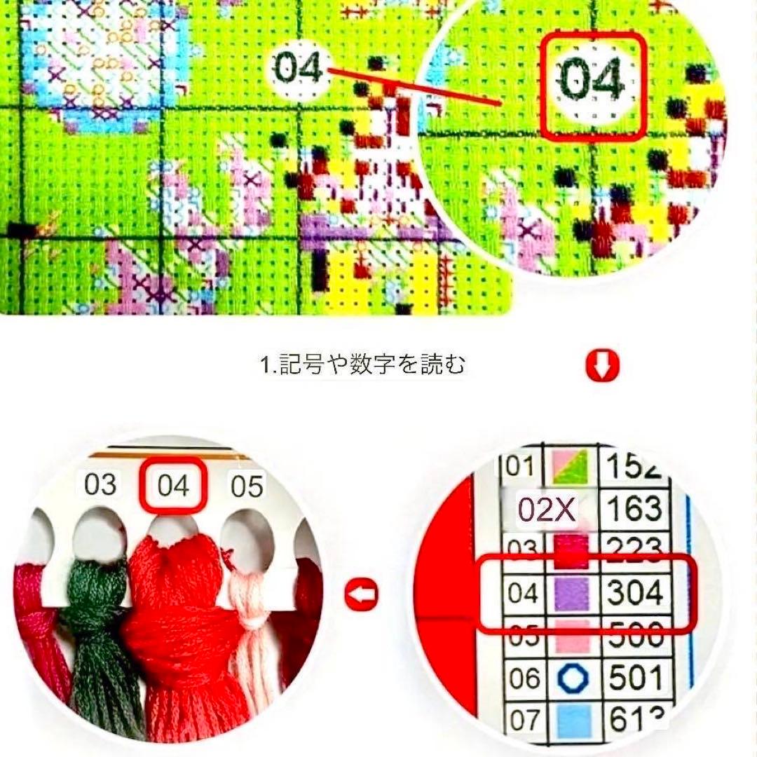 【特徴】 ①必要な材料は全て揃ってますので、直ぐに 初心者の方でも手軽に素敵な作品が作れます。 ②布のマス目に合わせて図柄を完成させる刺 繍の技法のひとつです。 ③細かい作業なので集中力や忍耐力など達成 感を得ることができます。