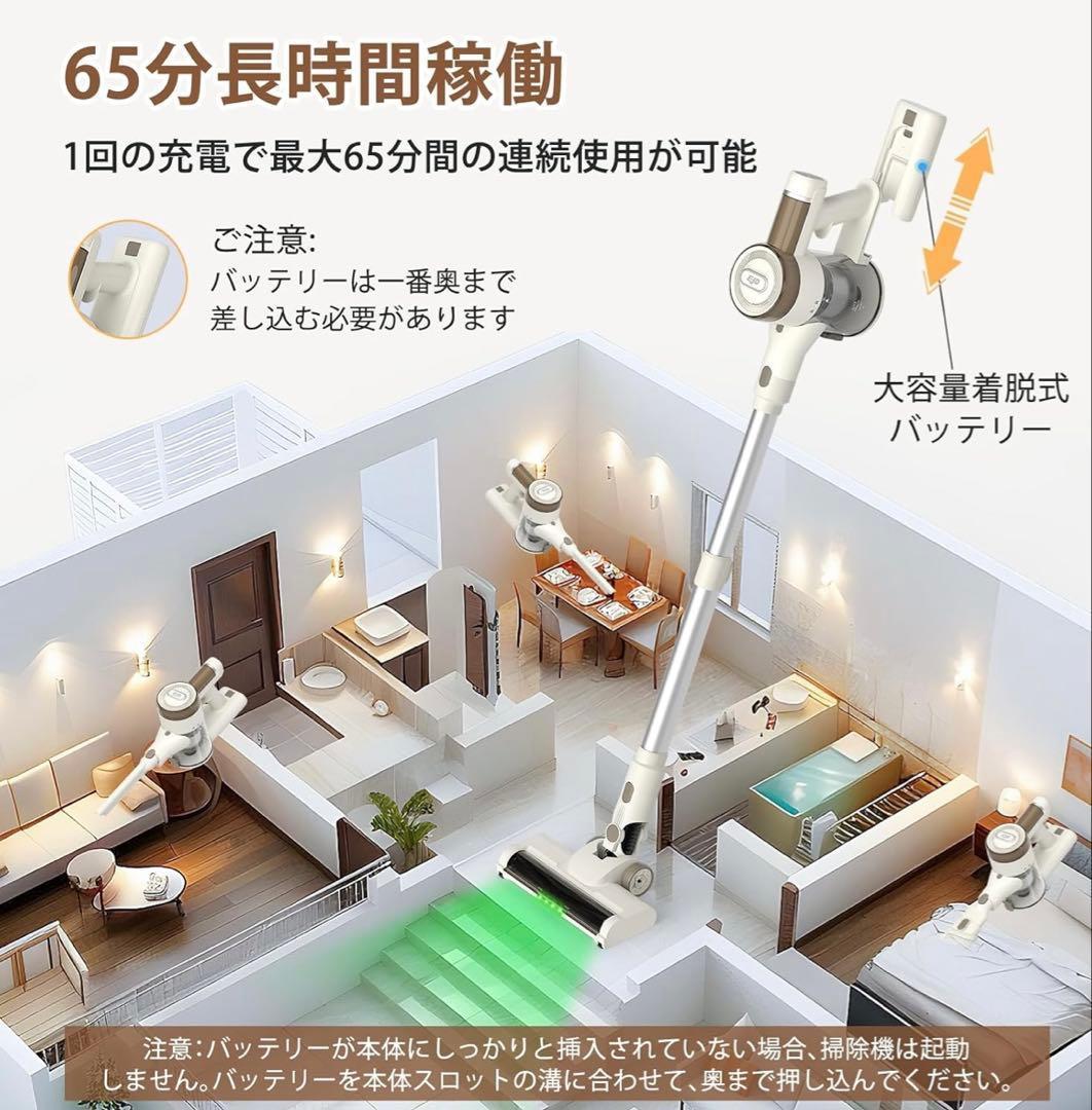 【65分連続駆動&着脱式バッテリーで「途中充電不要」】大容量バッテリー搭載で最大65分の連続駆動を実現(標準モード時)。3LDK~4LDKの広さも一度の充電でくまなく掃除可能。さらに「着脱式バッテリー」デザインで、予備バッテリーを用意すれば稼働時間をさらに延長。付属の自立収納スタンドは充電と収納を一体化,使用後はスタンドに置くだけで自動充電開始,コードの抜き差し手間も解消します。