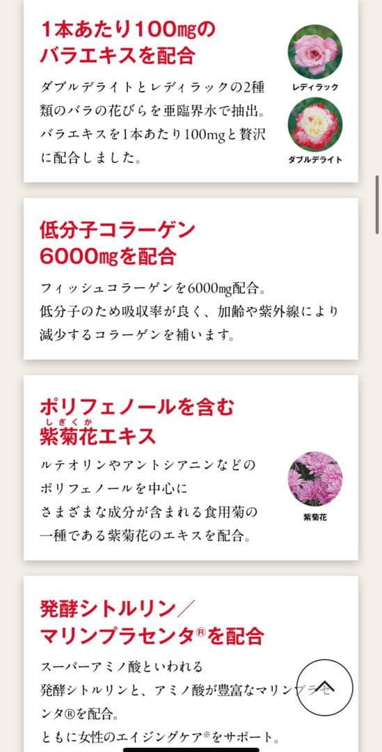 【特徴】 ✔ バラエキス 100mg配合(1本あたり) ダブルデライト & レディラックの2種のバラを亜臨界水抽出法で丁寧に抽出。 香りと美容成分を損なわずに抽出した高品質エキスです。 ✔ 低分子フィッシュコラーゲン 6000mg配合 吸収率が高く、年齢によるハリ不足をサポート。 ✔ 紫菊花エキス(ポリフェノール含有) 透明感・くすみケアに人気の美容成分。 ✔ 発酵シトルリン × マリンプラセンタ アミノ酸豊富で、エイジングケアに役立つ女性人気成分。 ✔ 飲むたびに広がるバラの香りでリラックス&美容ケア ⸻
