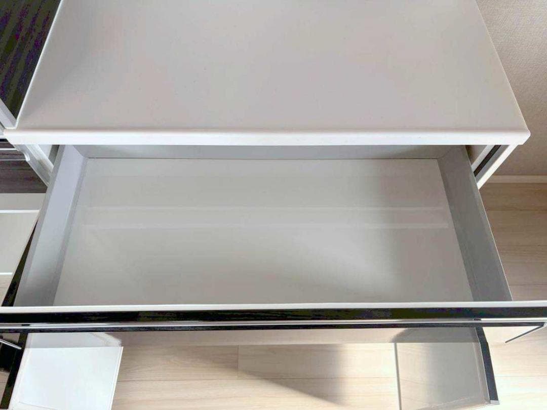 【仕様】 キャビネット:木製 扉:ホーロー製/中段アクリル製 引出し底板:ホーロー製 可動式棚板 耐震ロック モデルルームで展示されていた商品です。 ディスプレイされていただけなので綺麗な状態です。 新品では無い為、若干の傷や汚れなどは有るものとお考え下さい。