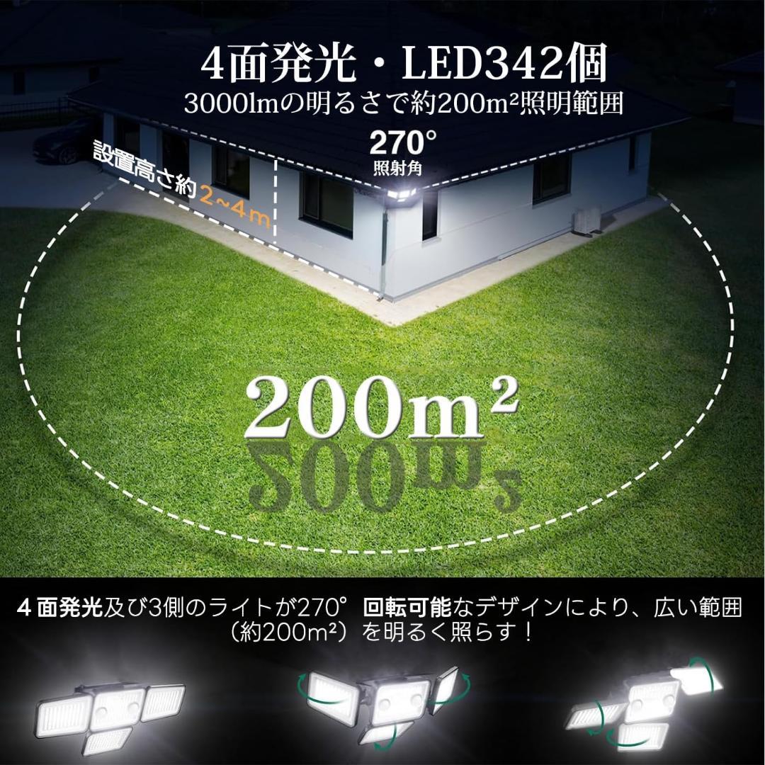 【3000mAh大容量革新・342個超高輝度LED・4面発光・300°広範囲照明・IP65防水】 本屋外用ソーラーライトは、昼光色7000Kの超高輝度LEDチップ342個を搭載し、4面発光の角度を自由に調整可能なランプ構造を採用することで、約300°の広範囲照射を実現しました。側面および下部のライトは回転可能であり、設置場所やニーズに応じて最適な照明が可能です。また、取り付け用ネジが付属しており、壁、木製フェンス、ガレージドアフレームなどへの設置が容易です。 ✳️