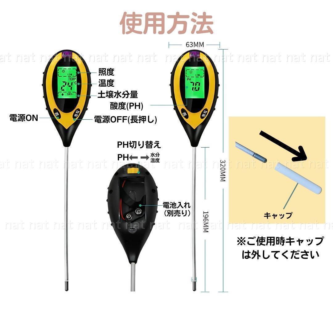 【 使用方法】 ・スイッチONを押して測定モードを選択 ・測定プローブを土に挿す(約10cm) ・1分後に測定データを確認 ・使用後はプローブを拭いて保管