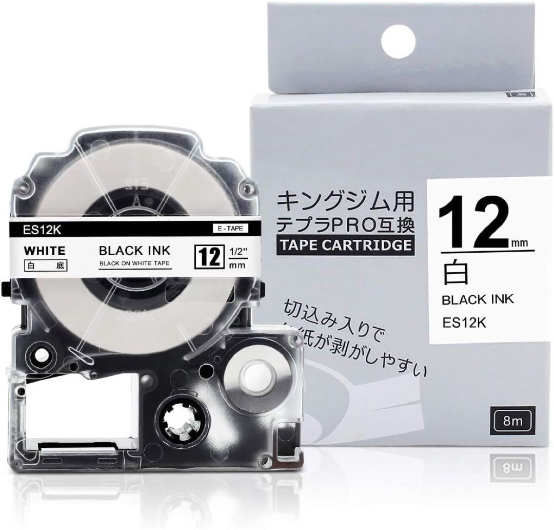 互換 テプラ テープ ES12K SS12K の互換品 1個セット。テープ幅 : 12mm 巻長さ : 8m 。色: 白地黒文字