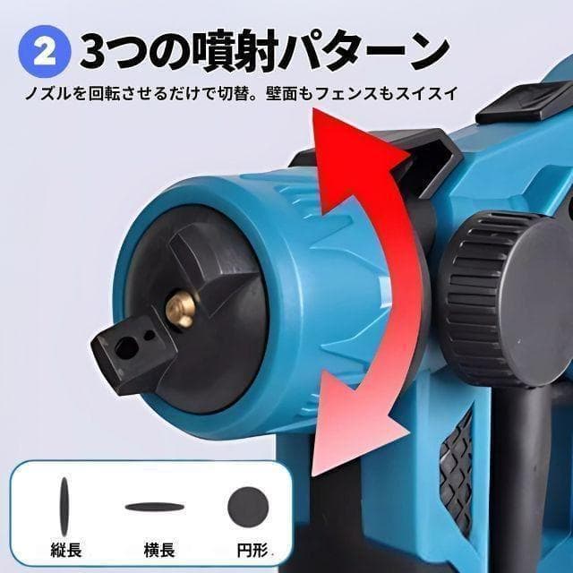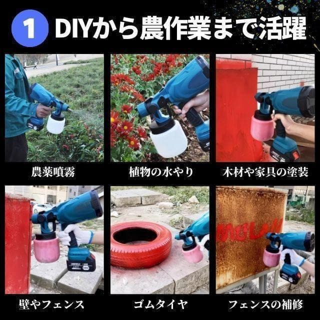 【主な特長】 1. コードレスで自由な操作性 電源コード不要で室内外問わずスムーズに噴霧。バッテリー駆動なので狭い場所や屋外作業もストレスフリーです。 2. 6つの主要な特長 - 高出力:広範囲の塗装にも対応 - 高霧化:超微粒子で均一噴霧、ムラを防止 - 高速放熱:安定動作と長寿命を実現 - 低騒音:家庭でも安心して使用可能 - 時短・効率的:作業時間を大幅に短縮 - 多用途対応:塗装、洗浄、農薬散布など幅広く活用 3. DIYや家庭用途に最適 ゴムタイヤや金属パーツのリフォーム、木材・家具の塗装、植物の洗浄・農薬噴霧、室内壁やフェンスの補修など、様々な用途に対応します。 4. 微細霧化噴霧 均一な霧で塗料の詰まりを軽減し、美しい仕上がりを実現。初心者でもムラなく塗装できます。 5. 高速放熱設計 優れた冷却性能で粉塵や熱を逃がし、機械の寿命を延長。内部へのゴミ侵入も防ぎます。 6. 流量調整機能 360°無段階ダイヤルで噴霧量を細かくコントロール可能。狭い箇所から広範囲まで思い通りに仕上げられます。 7. 多角度噴霧対応 ノズル切り替えで横吹き・縦吹き・円形噴霧が自在。壁面や凹凸のあるパーツもムラなくカバーします。 8. 大容量タンク 800mlタンクで交換回数を減らし、効率的に作業可能。液漏れ防止設計で塗料や薬剤の交換もスムーズです。 10. 詳細な製品設計 - 銅製ノズル:耐腐食性に優れ長寿命 - 簡単着脱:ボタン1つで取り外し可能、清掃やパーツ交換が容易 - 滑り止めハンドル:長時間作業でも疲れにくい設計